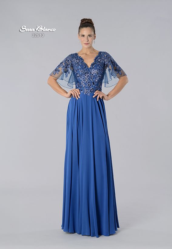 VESTIDO EN GEORGETE CON CUERPO CON ENCAJES Y GUIPUR CON PEDRERÍA BORDADA.