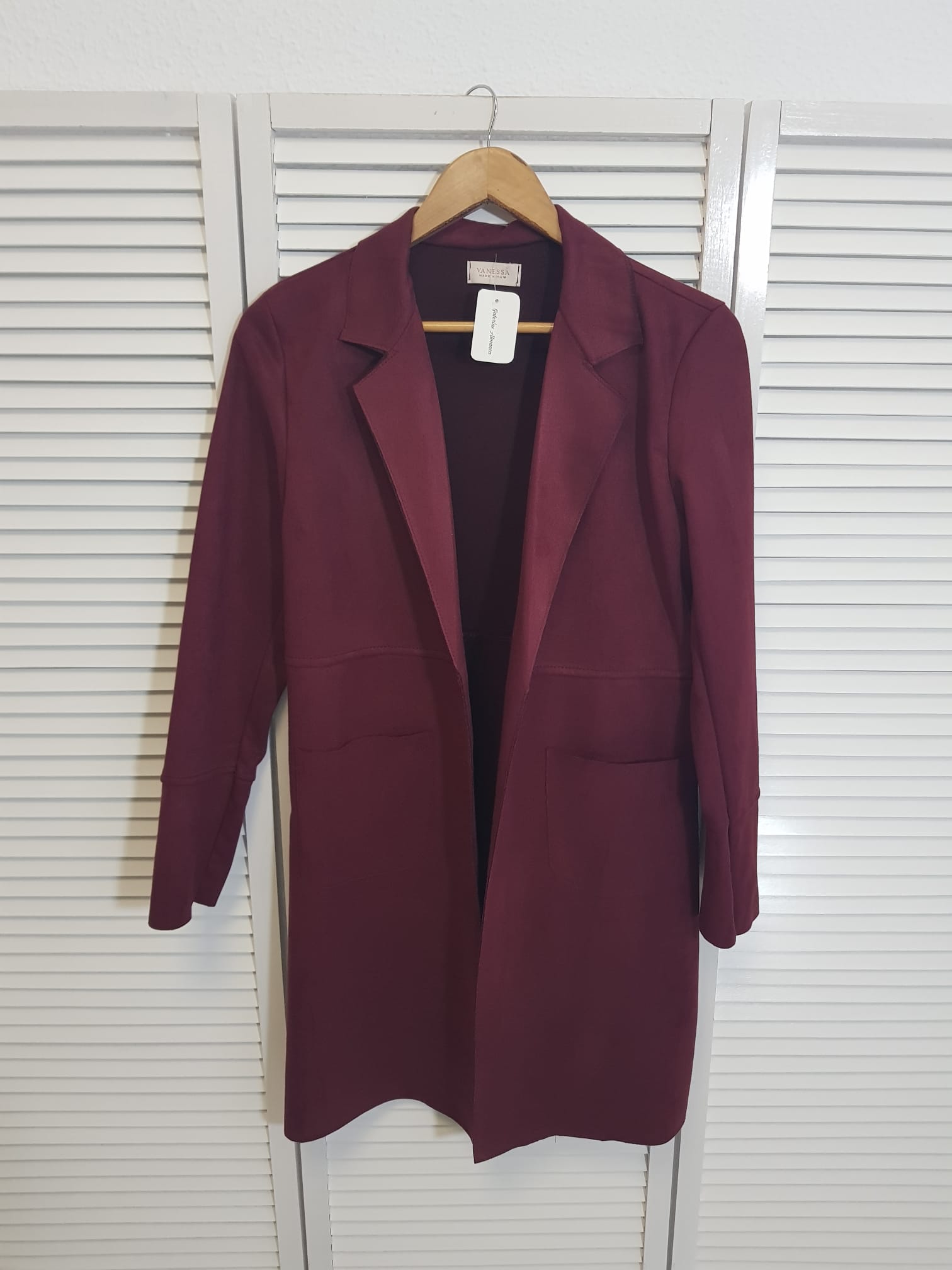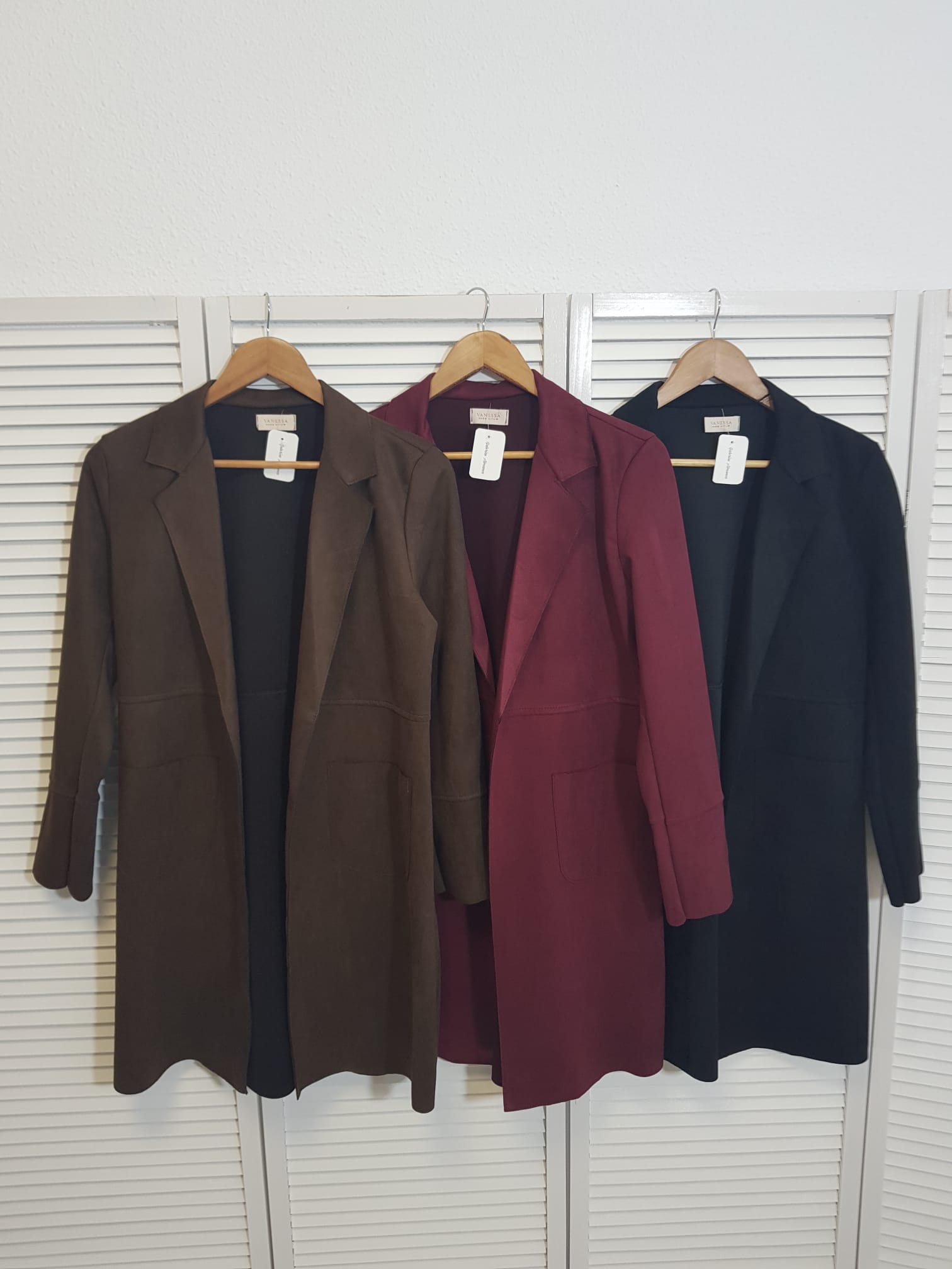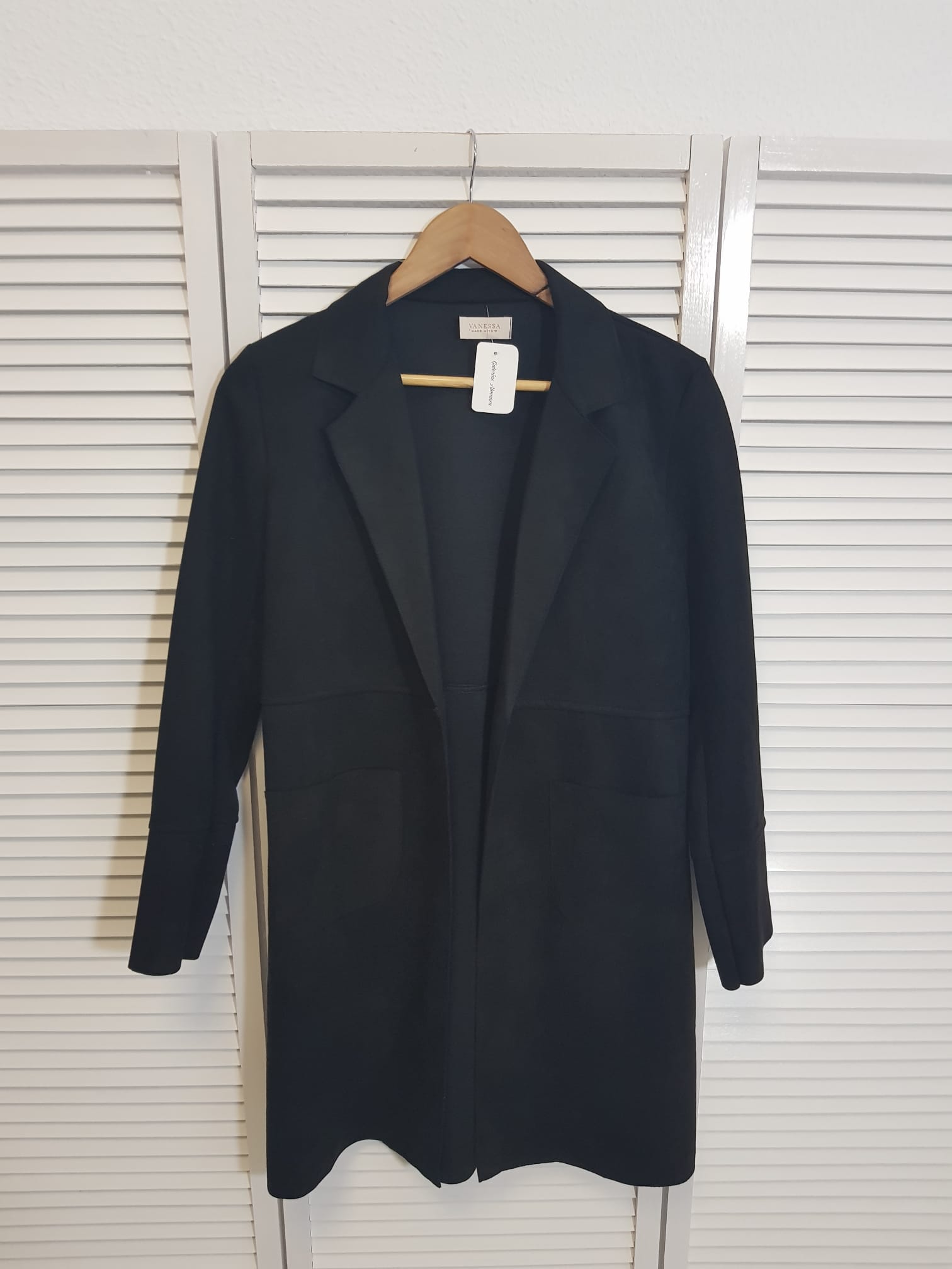 Abrigo sin botones con solapa y bolsillos delanteros.