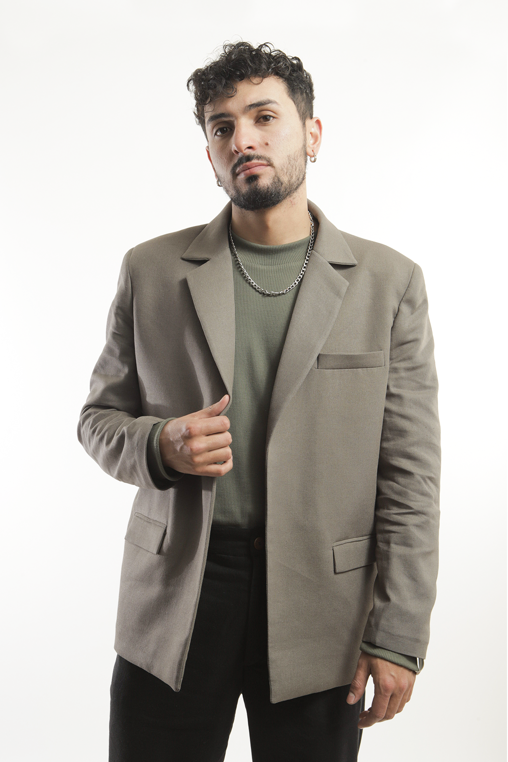 Blazer sastre estilo oversize con forro, bolsillo con tapa y hombreras; cierre de botón; tela 55% lino y 45 rayón; marquilla, talla, bandera, etiqueta y botón 100% eco.