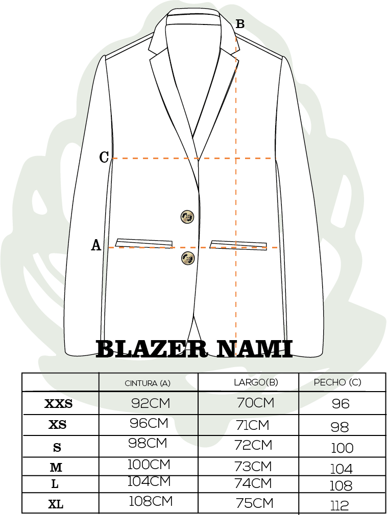 Blazer sastre con forro, bolsillos con tapas y hombreras; cierre de botón Abeto, cinta en la parte interna Abeto; tela 55% lino y 45 rayón; marquilla talla, bandera, etiqueta, cinta y botón 100% eco.