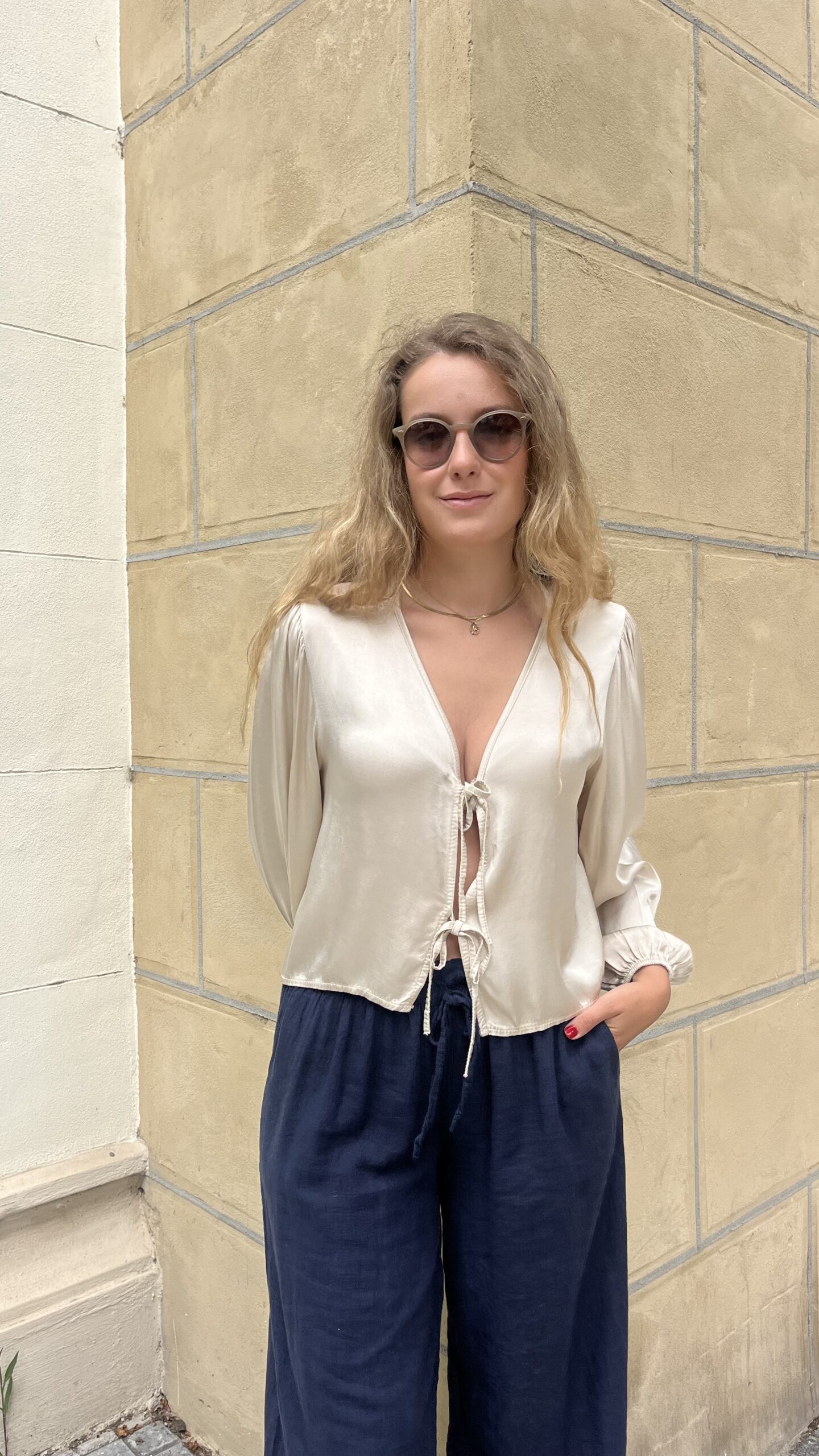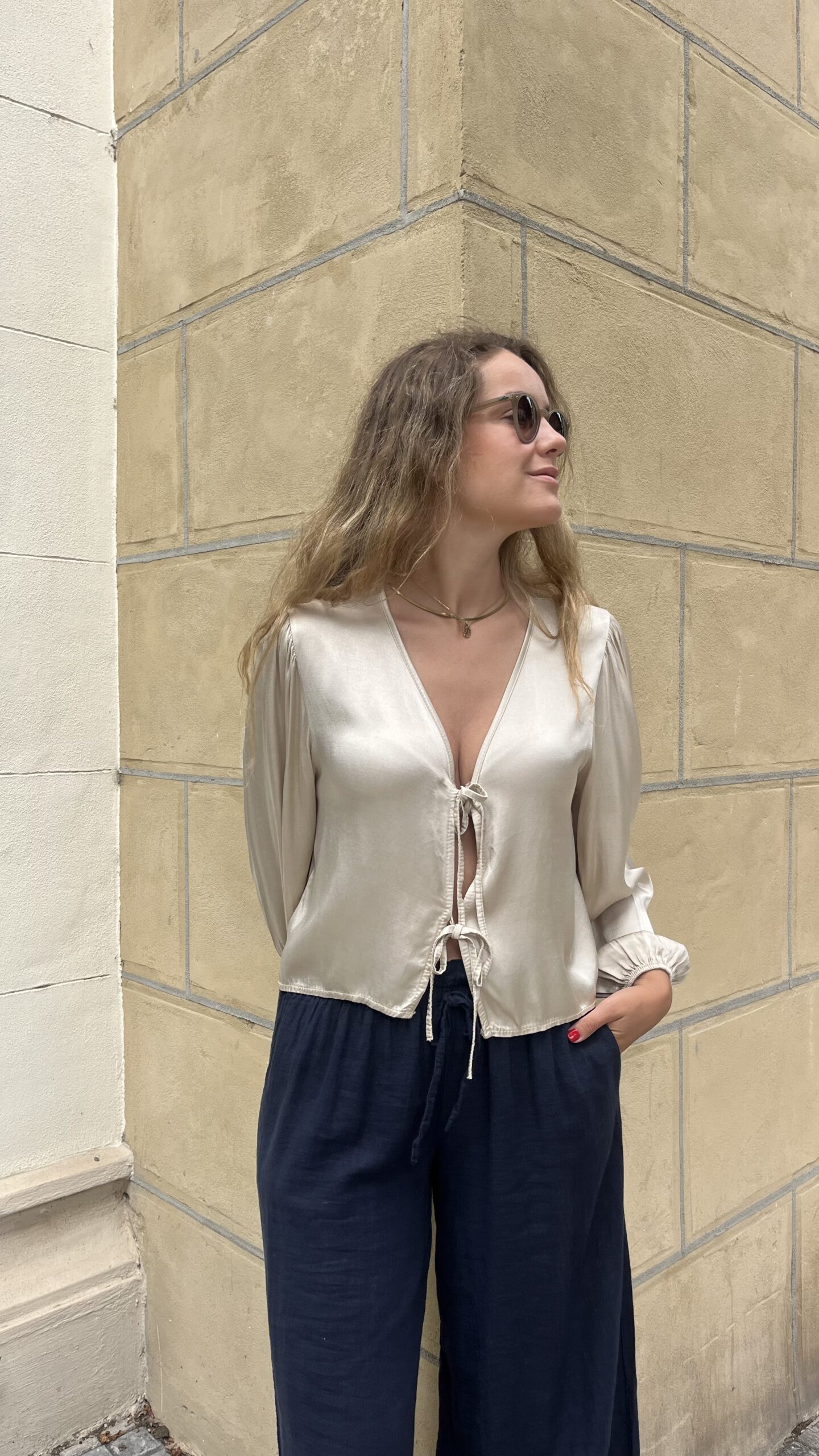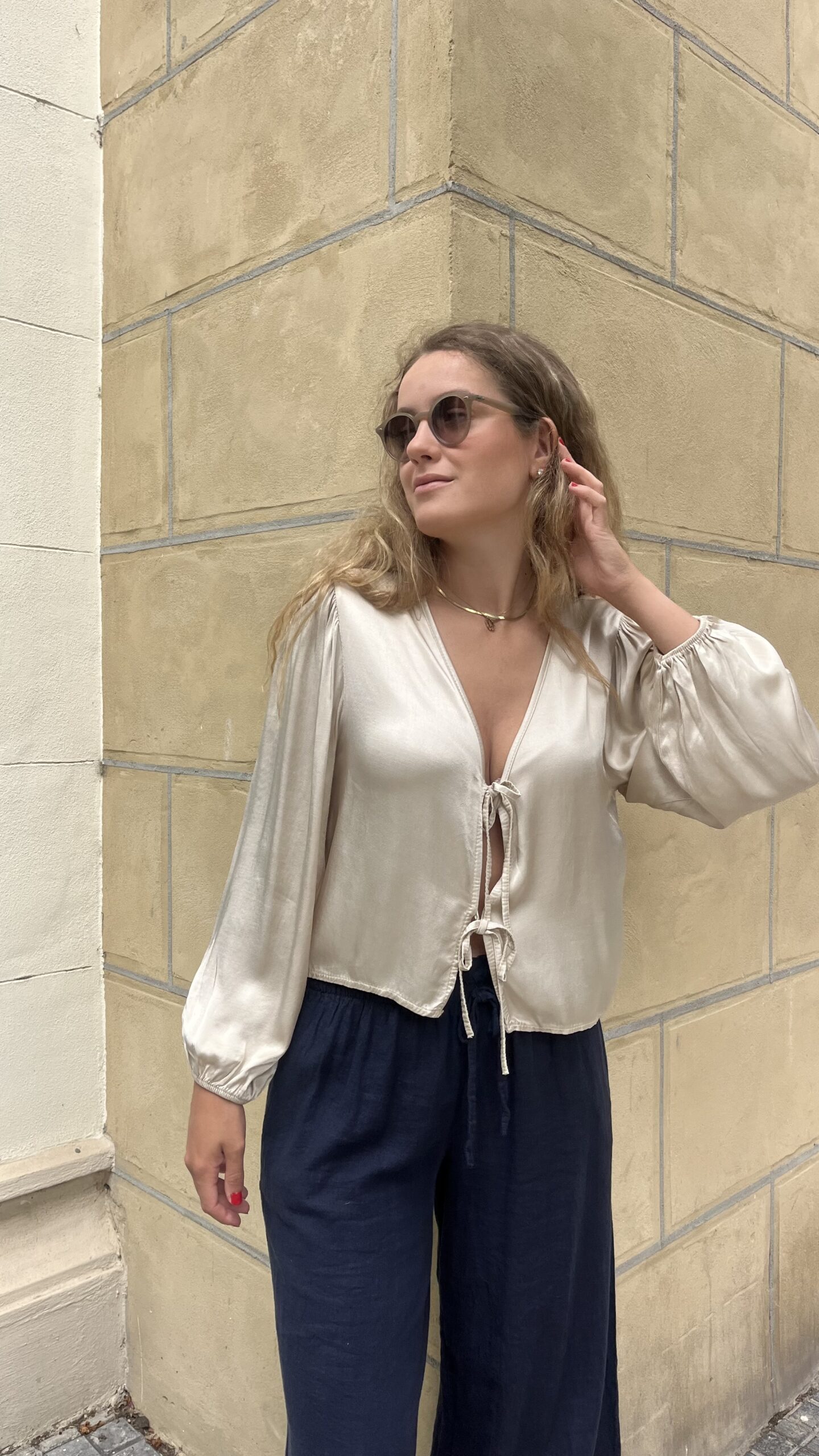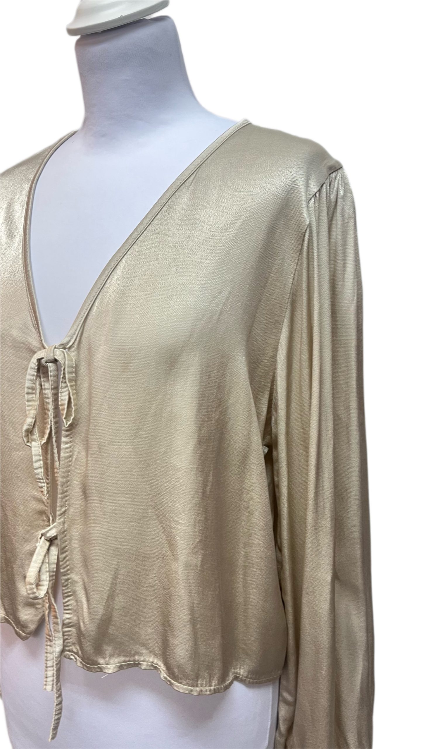 - Blusa de satén con lazos y manga larga abullonada.
