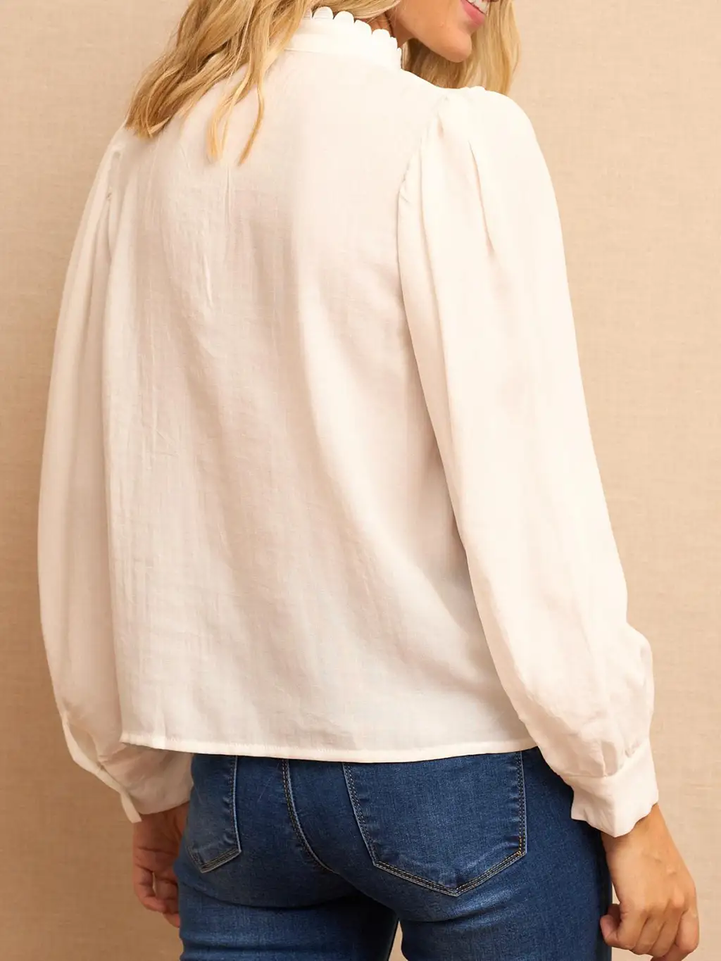 Blusa blanca tejido fluido, manga abullonada y tiras bordadas integradas en cuello y parte delantera, disponible en diferentes tallas.