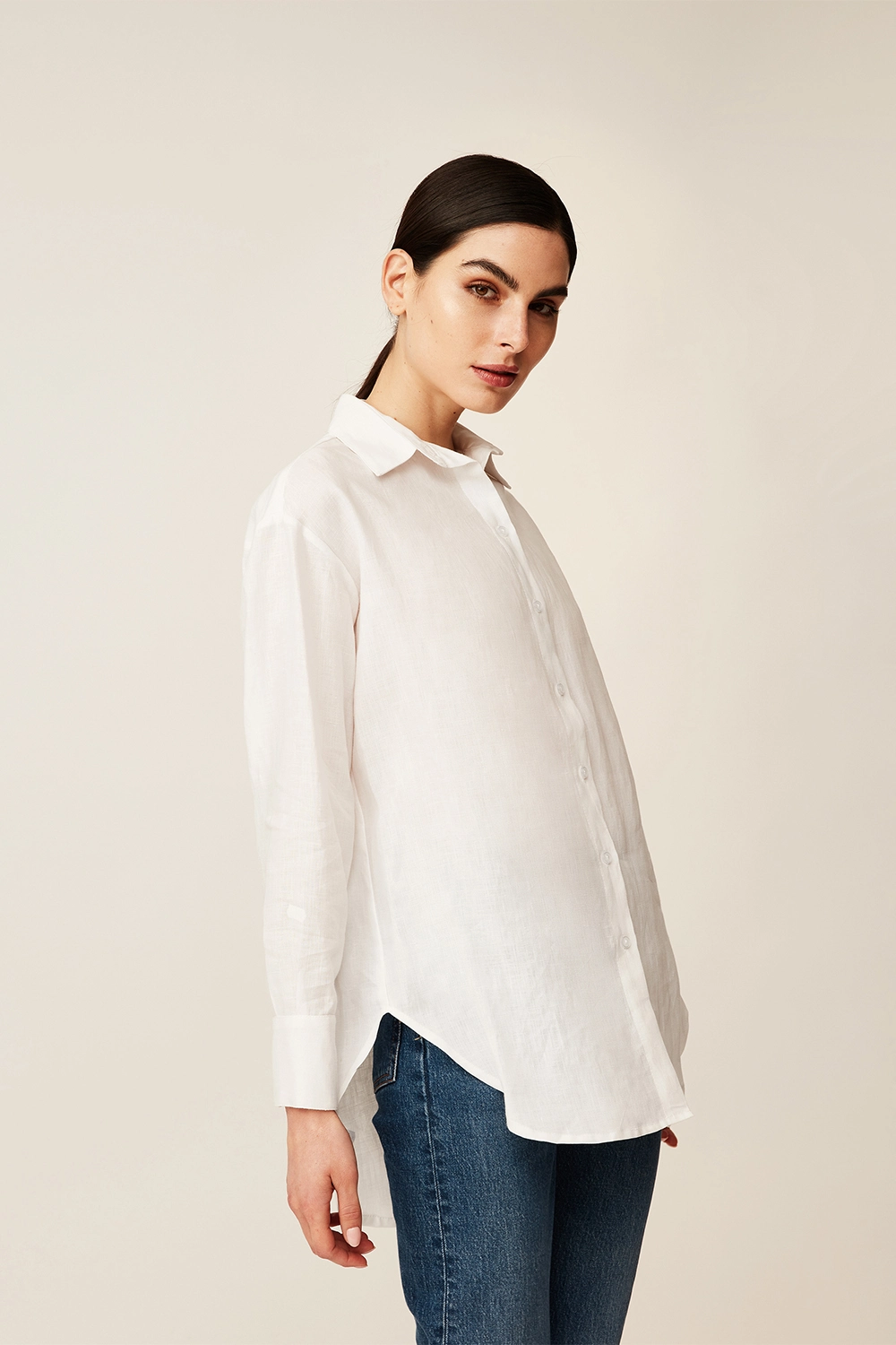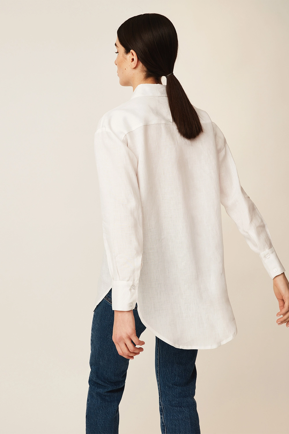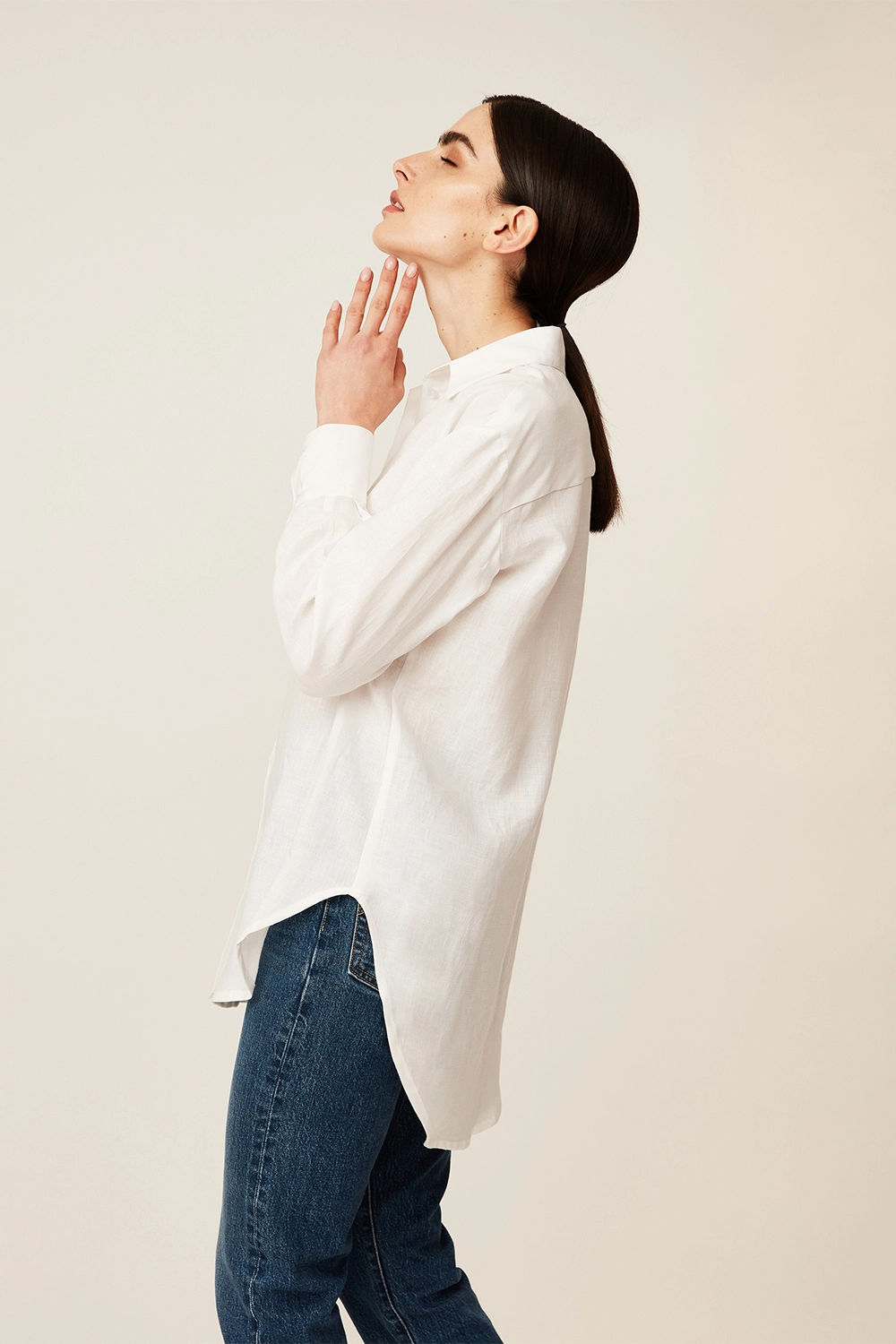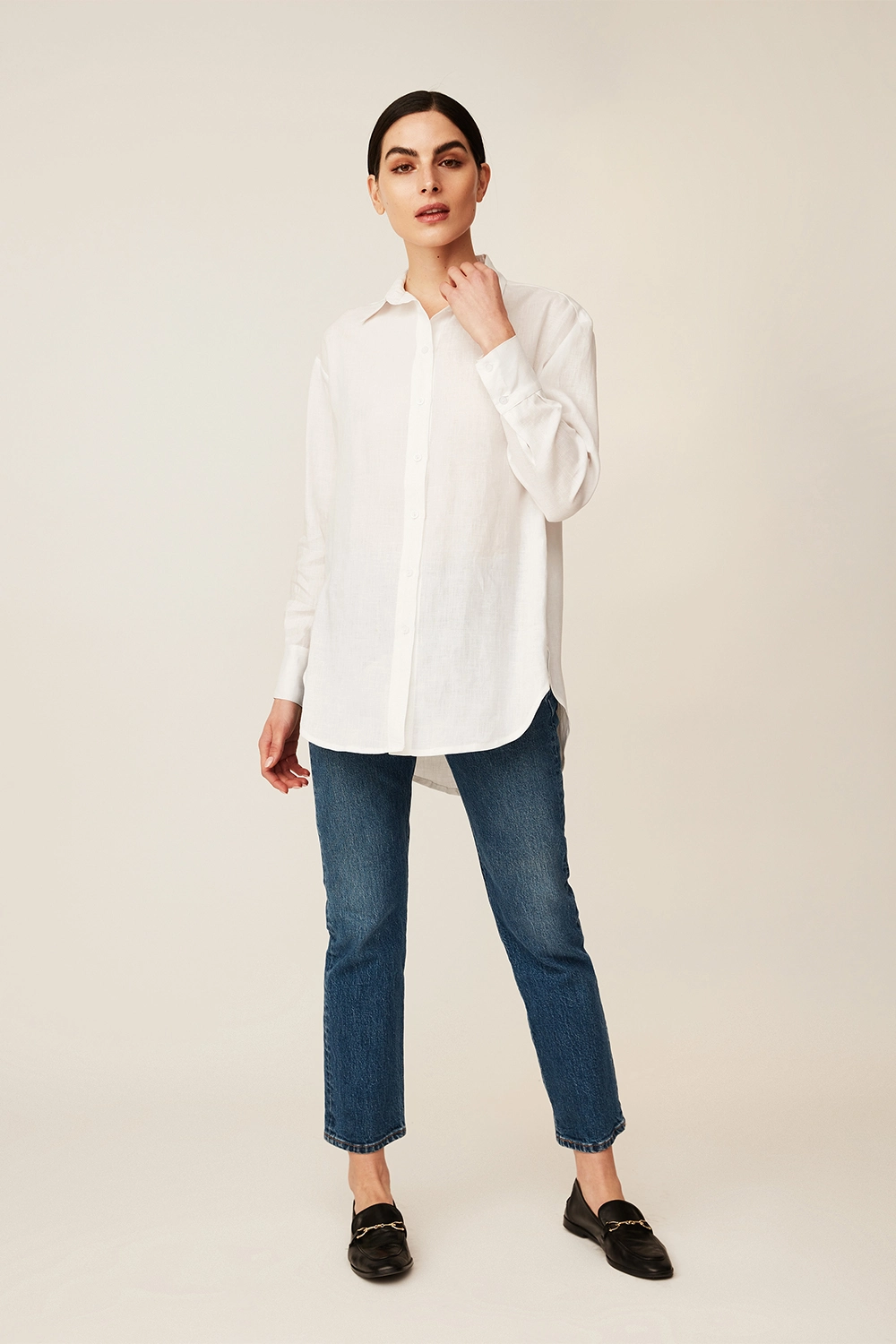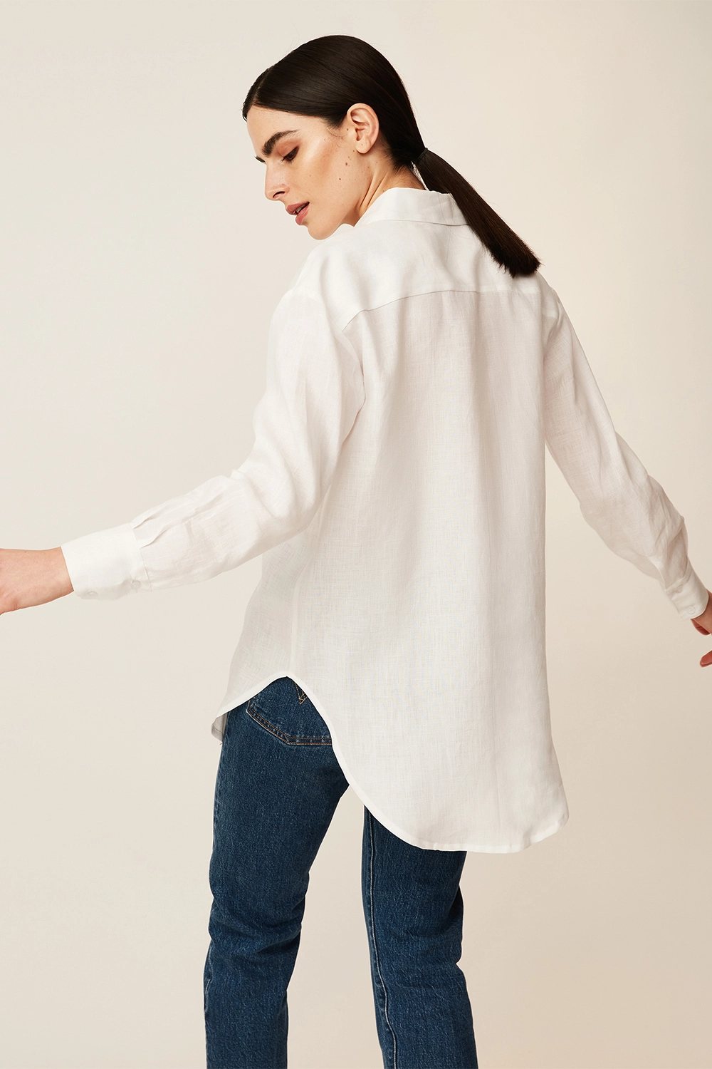 Blusa larga de corte básico estilizado fabricada en el más exquisito, fresco y delicado lino 100% con propiedades únicas que le permiten absorber muy bien el calor. Tiene manga larga, cuello camisero y abotonadura en delantero y puños.