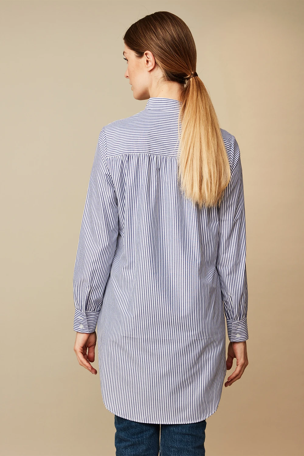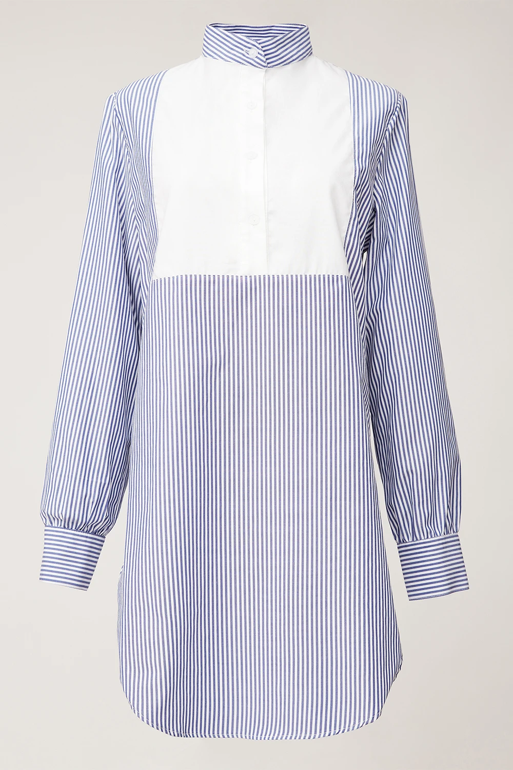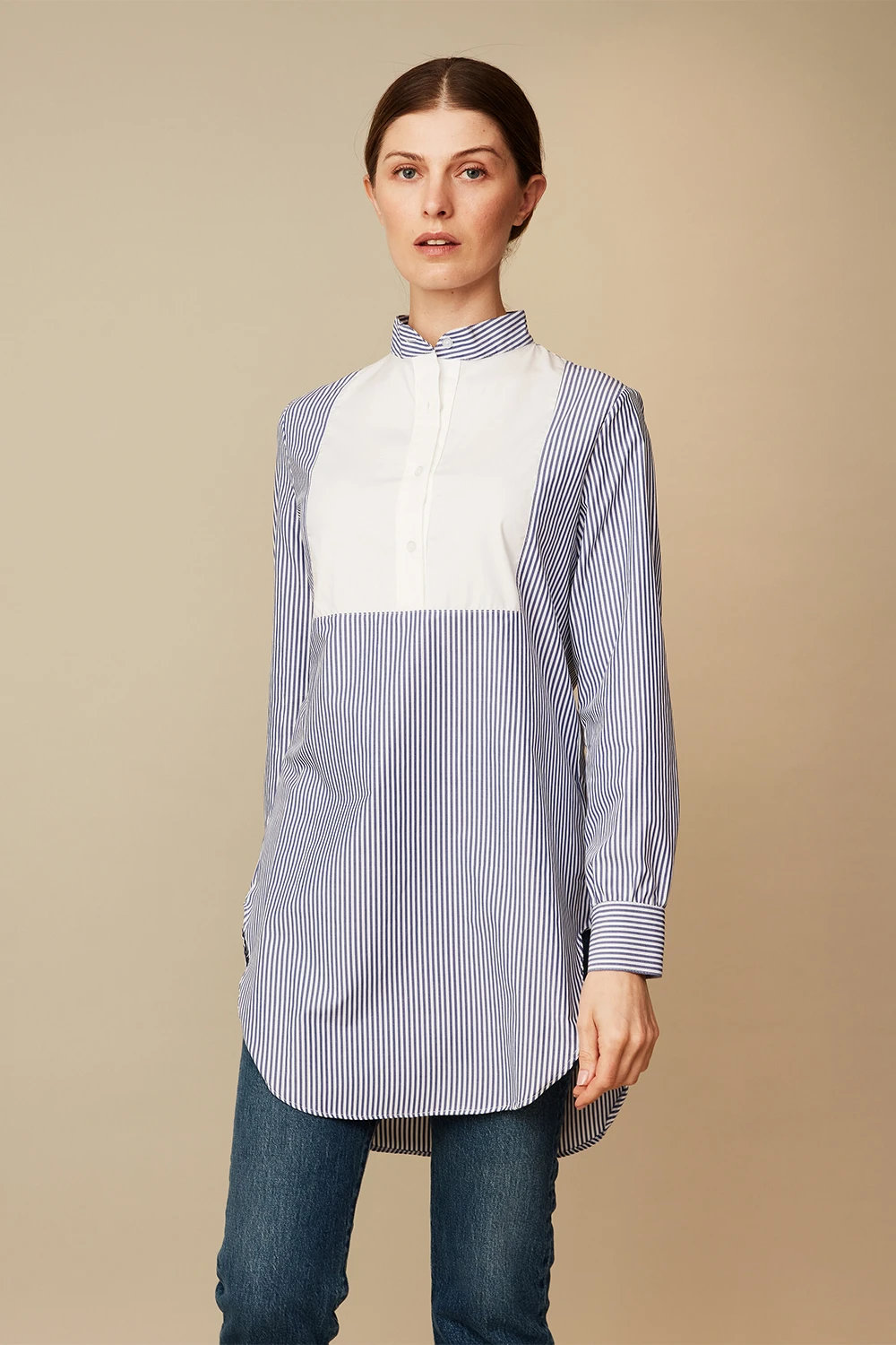 Blusa de estilo esmoquin con pechera delantera, fabricada en algodón 100% de larga duración, suavidad y sedosidad extrema que impide la irritación al contacto con la piel. Manga larga, cuello mao y abotonada en delantero y puños.