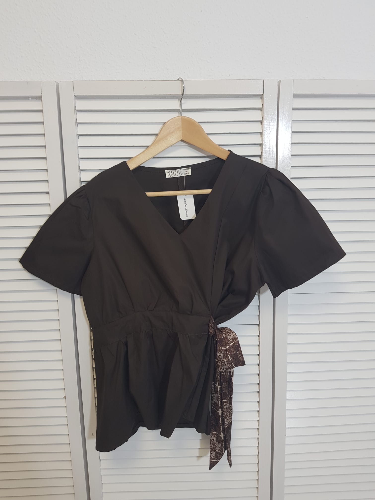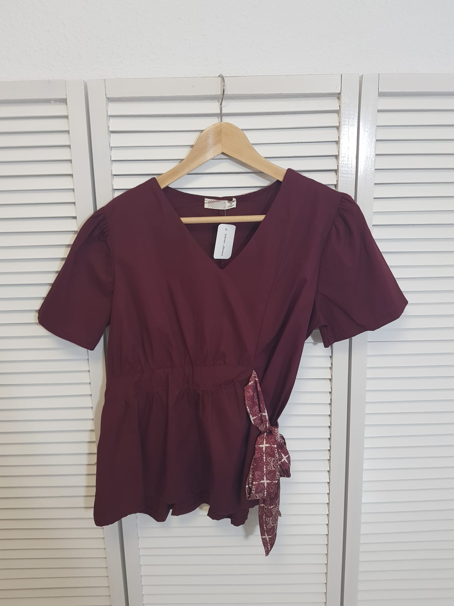 Blusa de manga cota de escote en pico y con detalle de lazada en raso en el lateral.