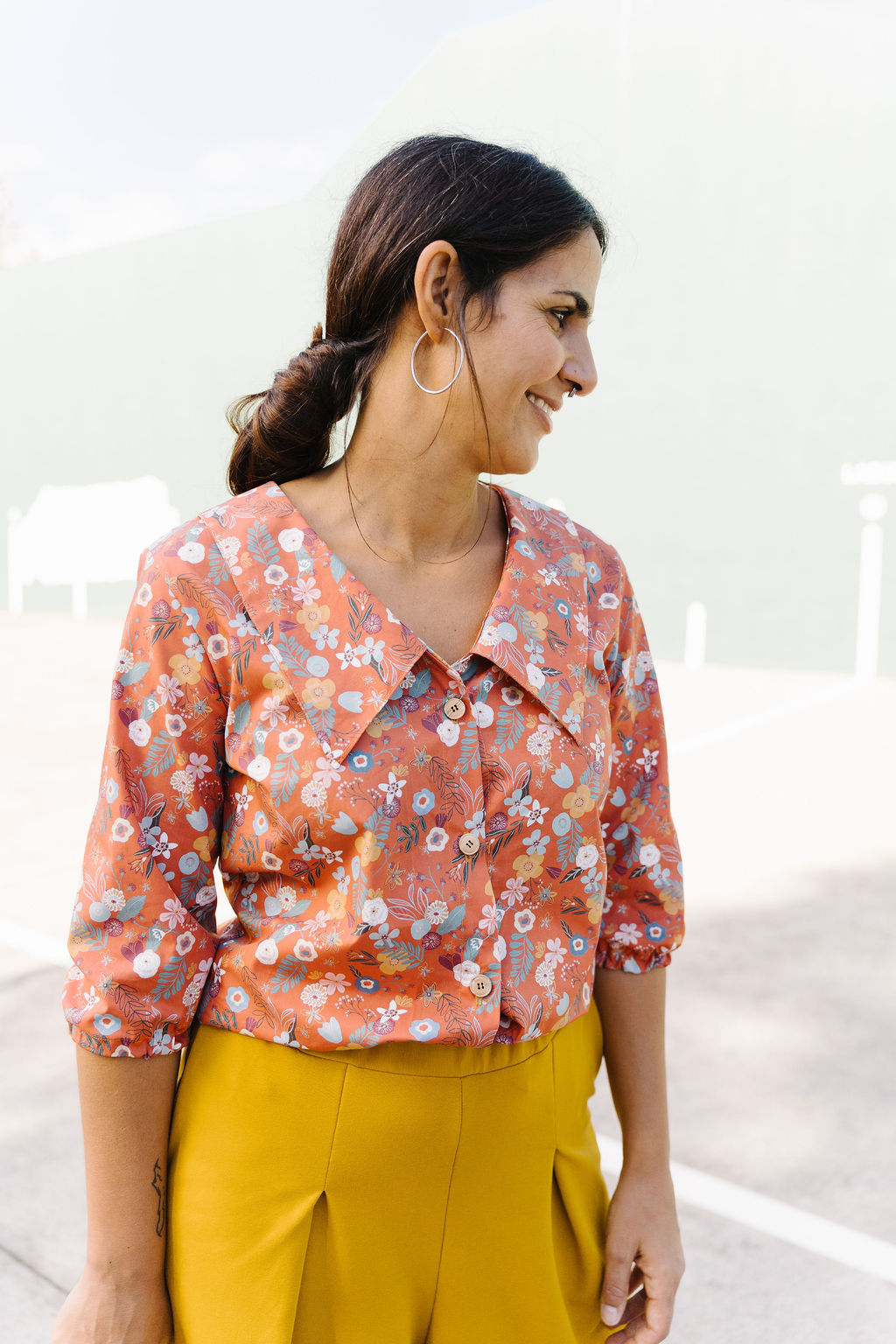 Esta blusa con maxi cuellos y estilo retro, será tu favorita del otoño, fondo caldera con estampado florar en tonos mostaza, rosa, burdeos, azules… ¡muy fácil de combinar con todo tu armario!