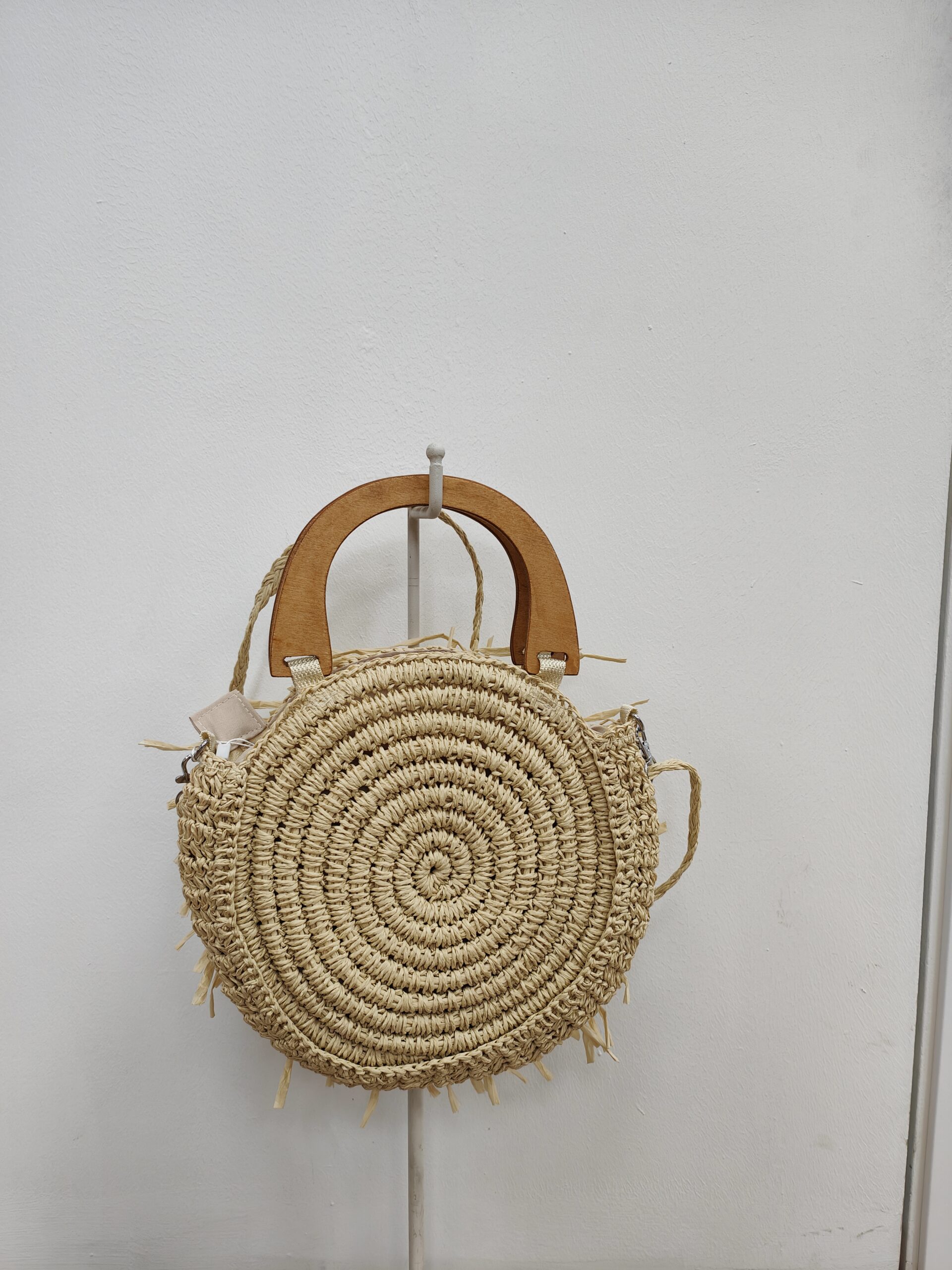 Bolso de Rafia, con las asas de madera y motivo de conchas en el centro del bolso. Es versátil, ya que puedes darle la vuelta y lo tienes más extremado , con las conchas o liso. Lleva cinta para colgar en bandolera.