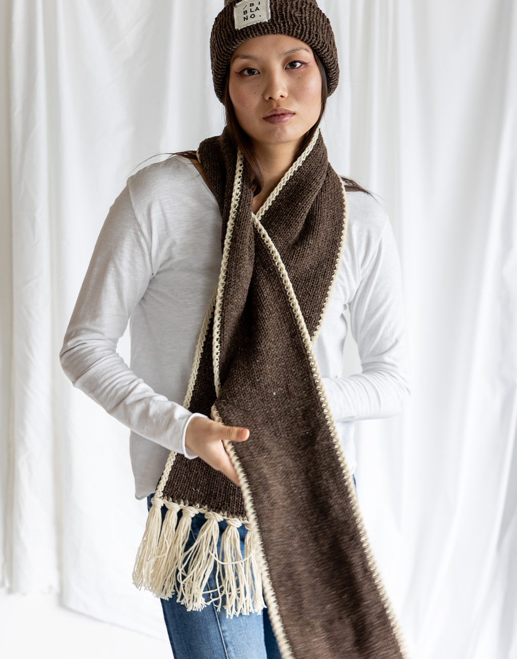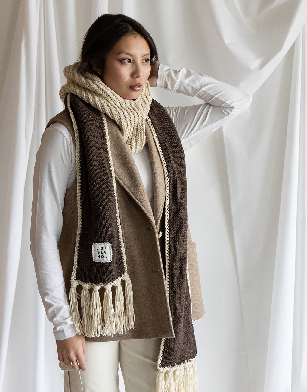 Envuélvete en la calidez y estilo de nuestra nueva bufanda, cuidadosamente tejida con lana 100%. Sus remates en contraste agregan un toque distintivo, resaltando la artesanía excepcional. Un accesorio que ofrece una declaración de moda consciente y artesanía auténtica.
