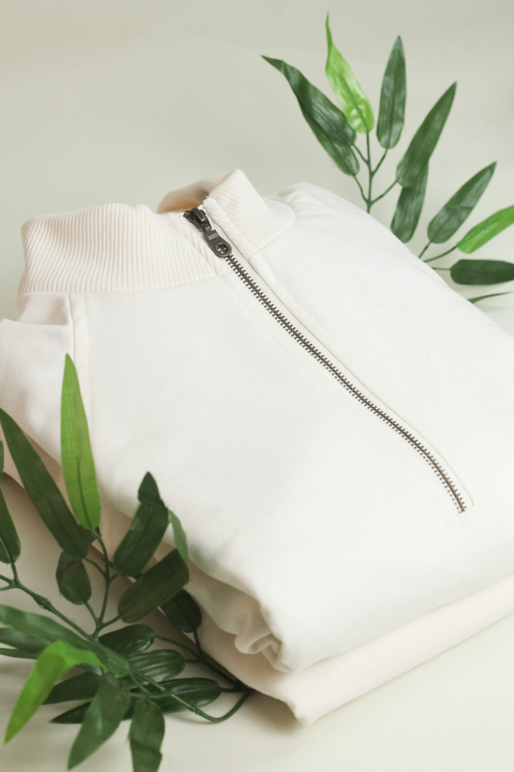 Buzo cuello tortuga forrado; tela burda 65% Poli y 35% algodón, pretinas y puños en RIB; cierre con cremallera color marfil; estampado de ABTO delantero; marquilla, talla, bandera y etiqueta 100% eco.