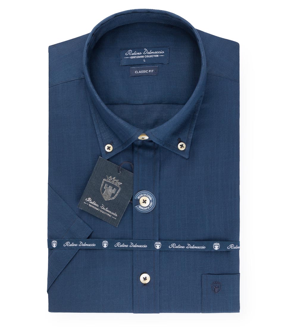 Camisa de manga corta efecto lino de fácil planchado, en patrón clásico. Interior del cuello con cinta decorativa. Bolsillo en el pecho con bordado de la marca, cuello abotonado y botones color marfil.