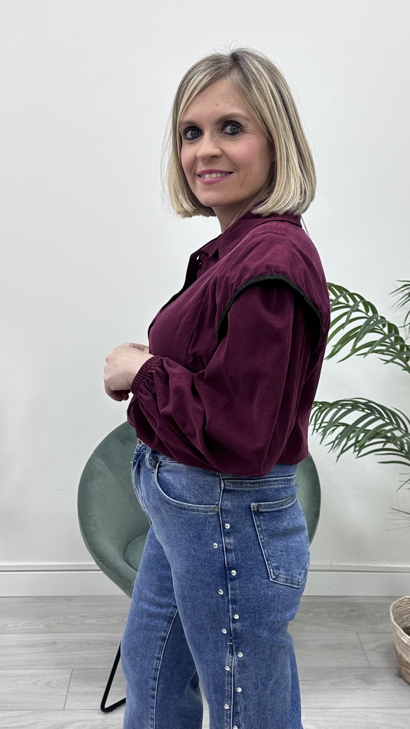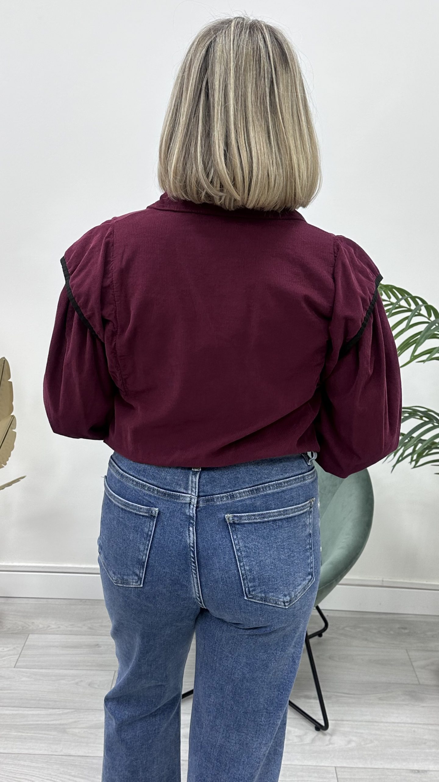 Camisa micropana detalle volantes en hombros con ribete contraste en negro