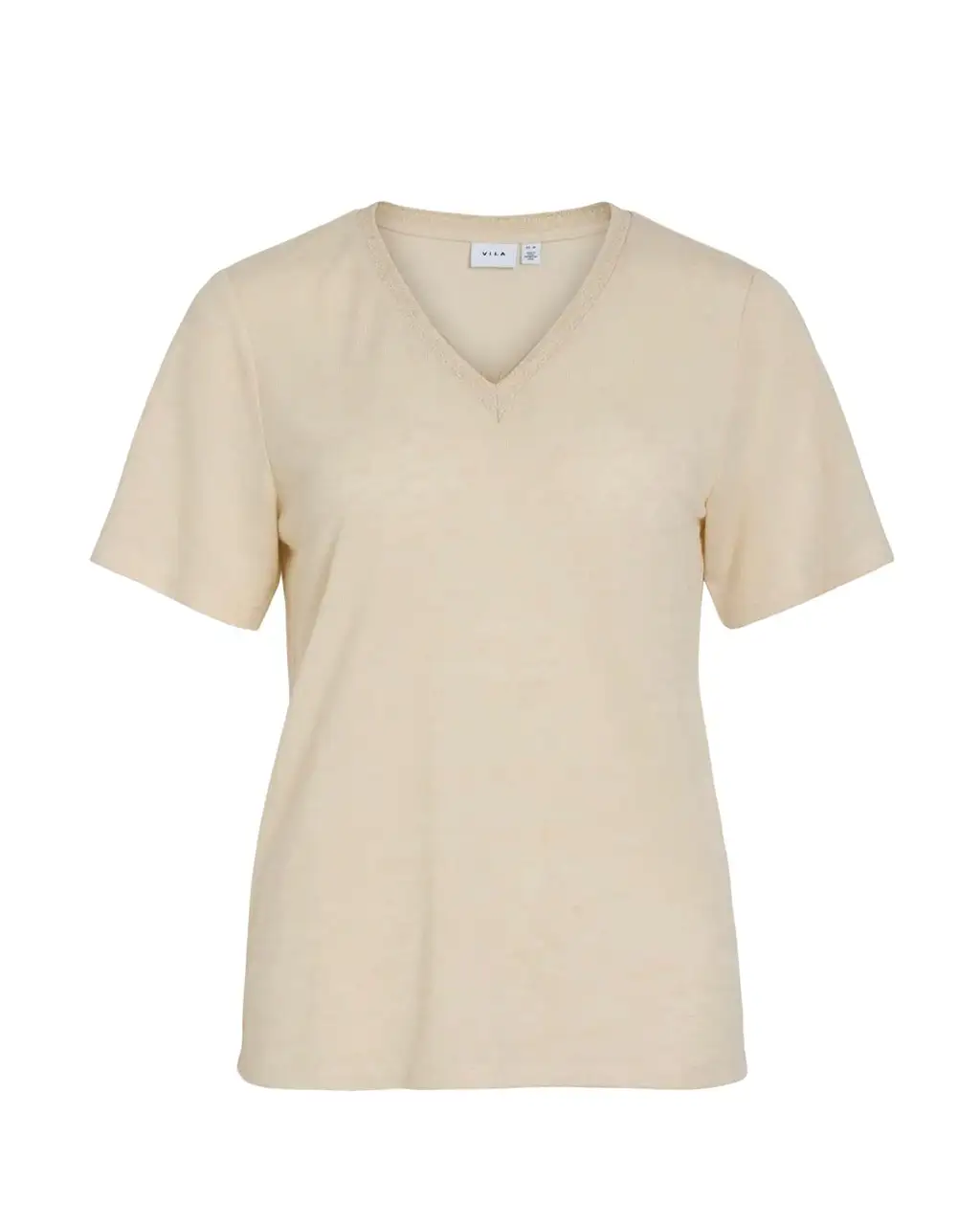 Camiseta cuello picoc olor beige con ribeteado con hilo dorado y bordado en el mismo tono de la camiseta, de la marca VILA. Disponible en diferentes tallas.