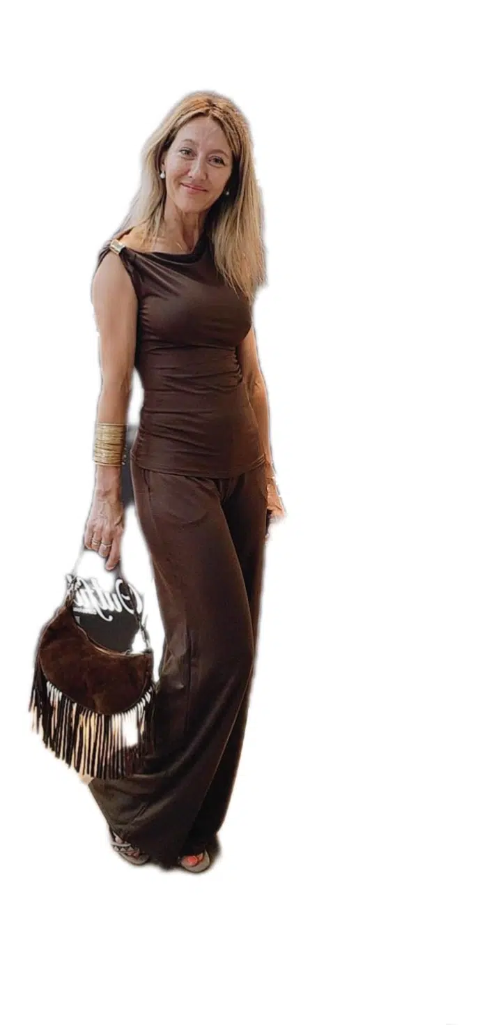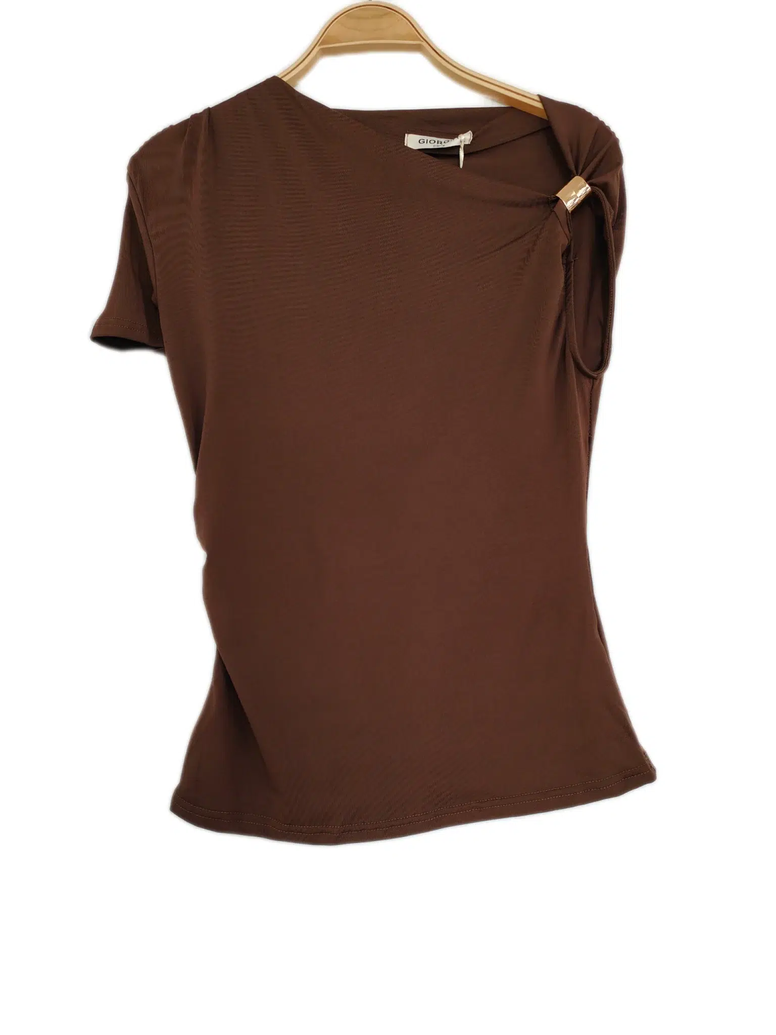 Camiseta licra con motivo metalico dorado hombro. Dos tallajes y dos colores marrón chocolate y negro.