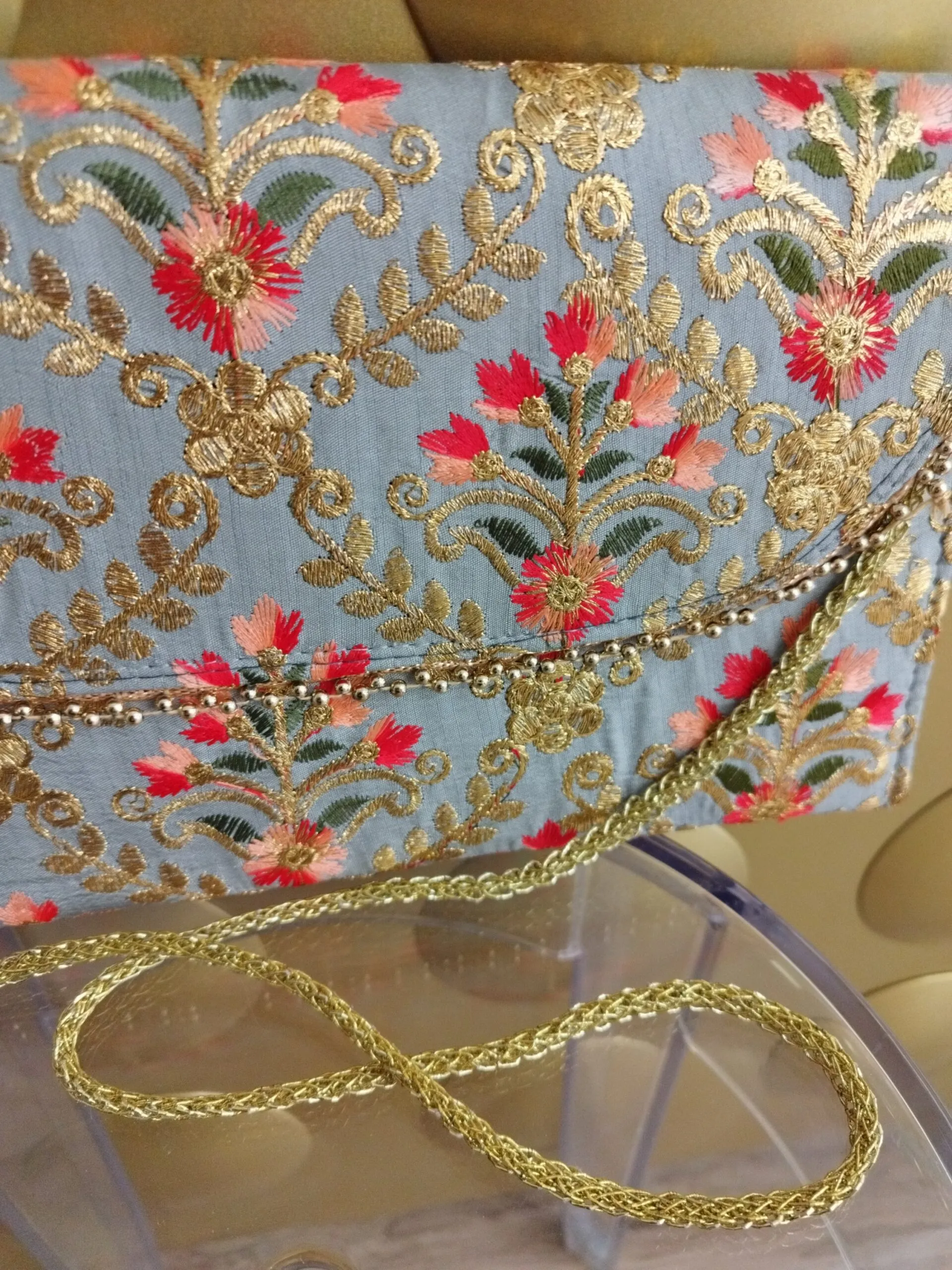 Cartera bordada con cierre de solapa. Cuerda para colgar. Medidas 29/17cm