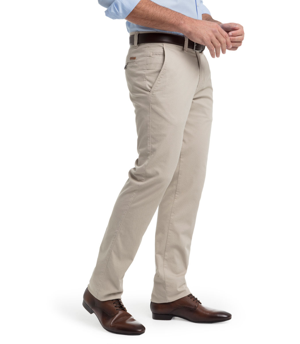 Pantalón Chino fabricado en estructura de algodón. El patronaje recto y el tejido elástico lo hacen muy cómodo. Lleva la relojera en la vista del bolsillo delantero. Confección y forrería de calidad superior, Fabricado en España.