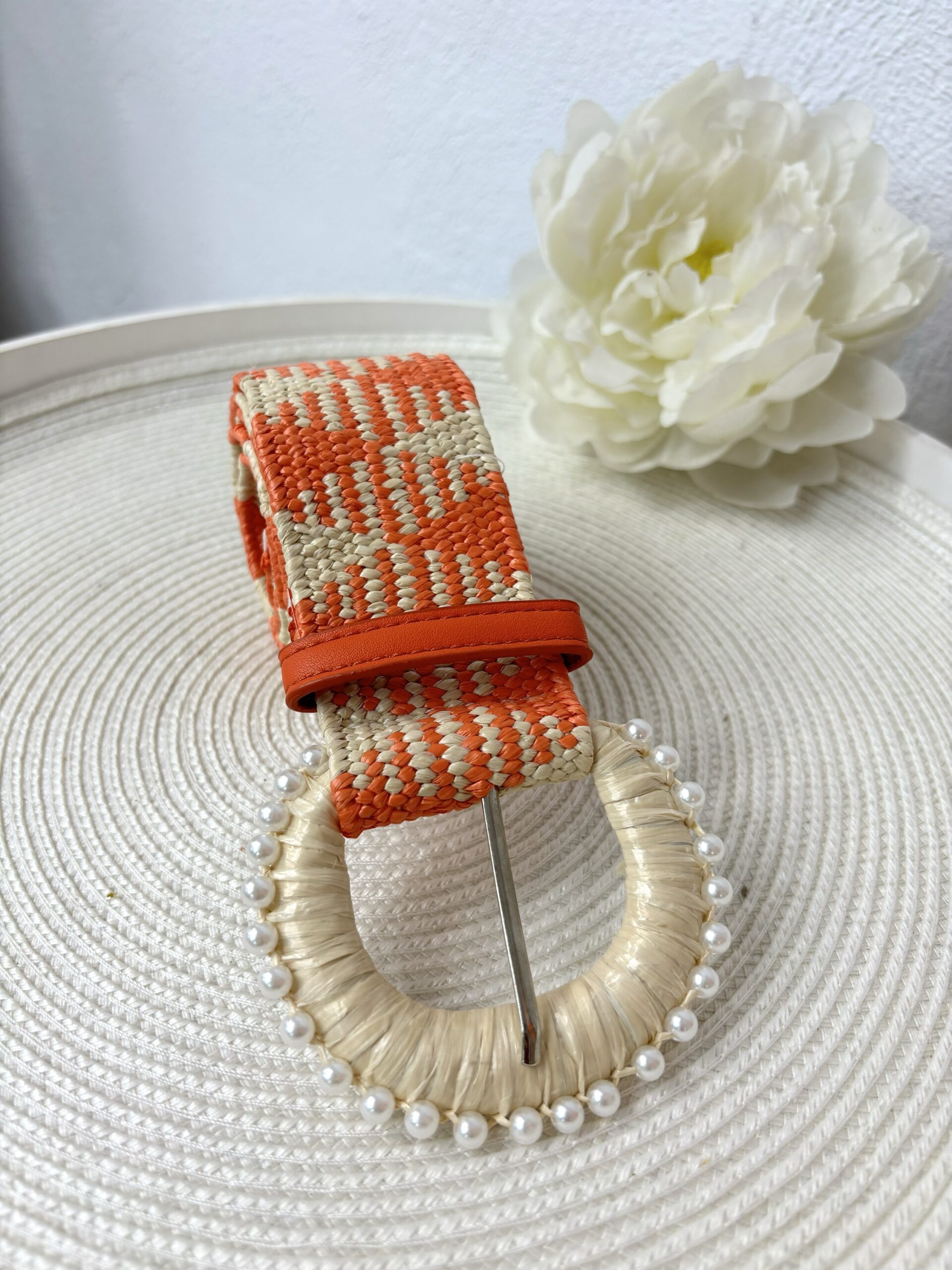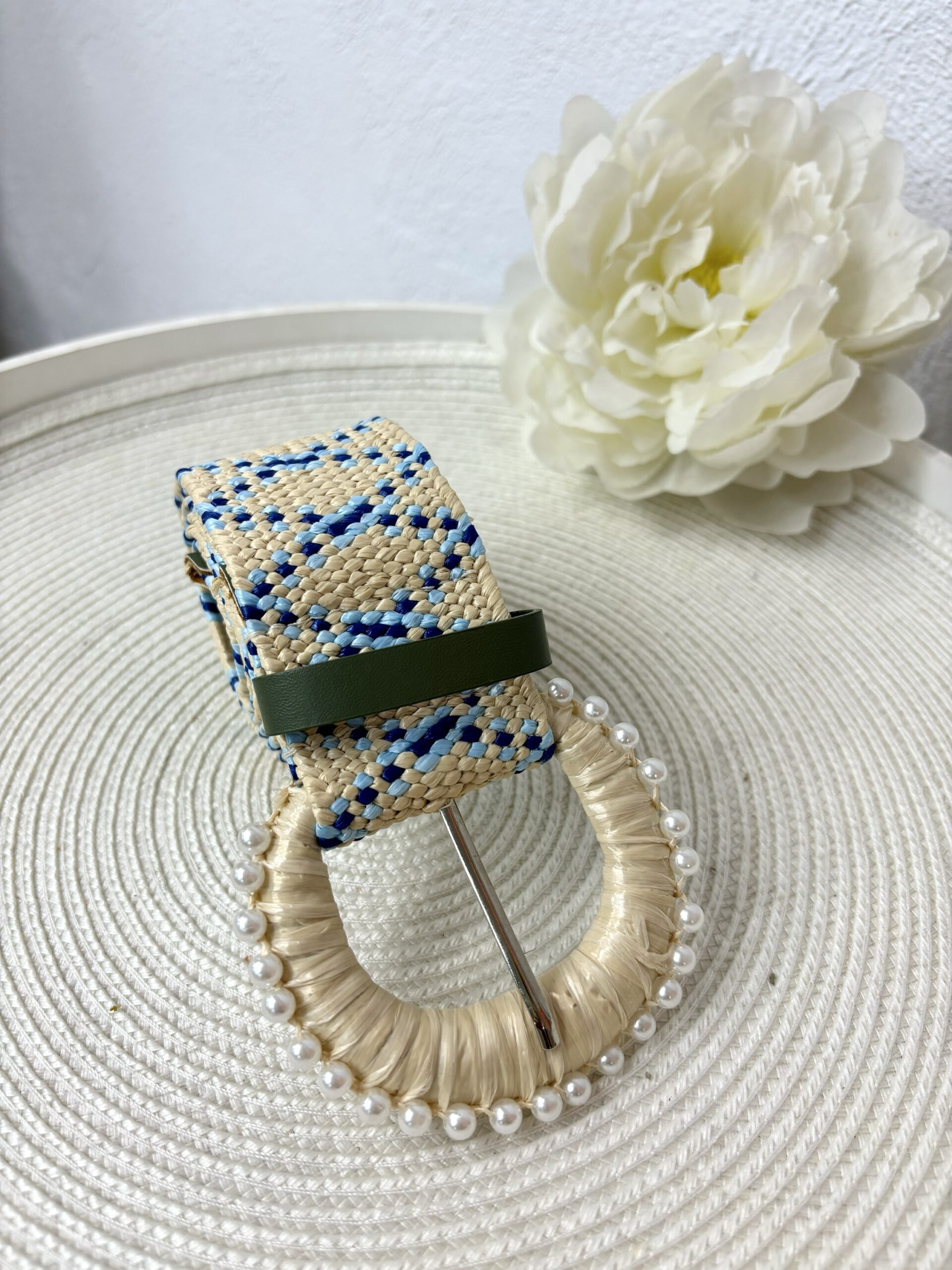 Cinturón de rafia elástico, combinada en dos tonalidades,con hebilla redonda de perla, talla 95 extensible .