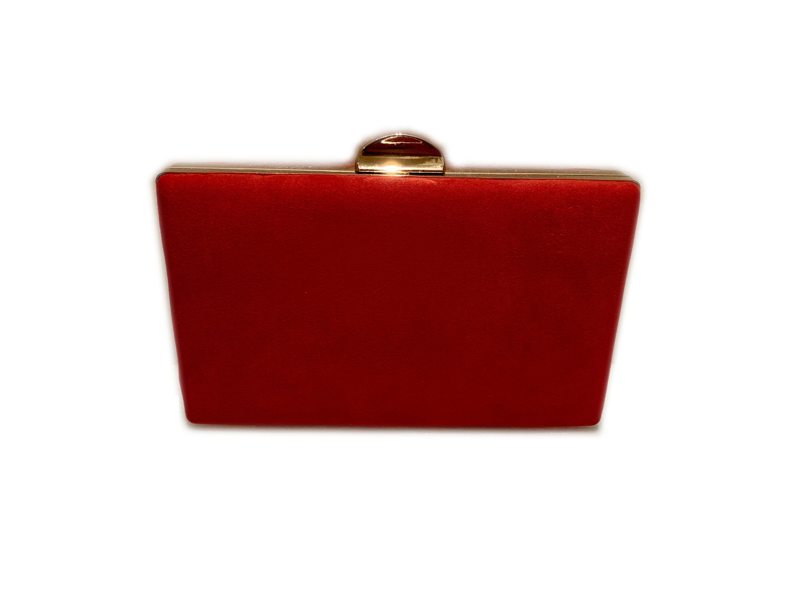 Clutch en antelina con cierre en dorado y cadena para colgar.