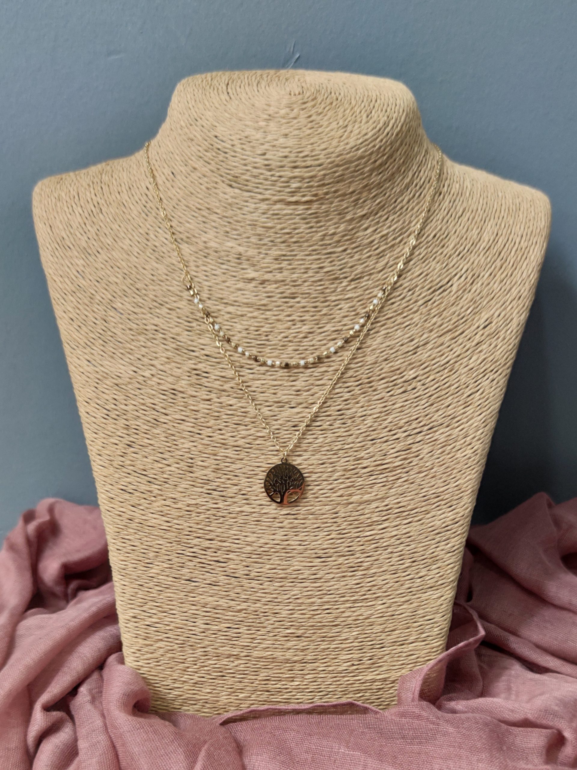 Collar dos caídas en acero inoxidable quirúrgico de color oro, adornado por un colgante del árbol de la vida y pequeñas bolitas en tonos tostados y tierras en su cadena más corta. Cierre con cadena de extensión.