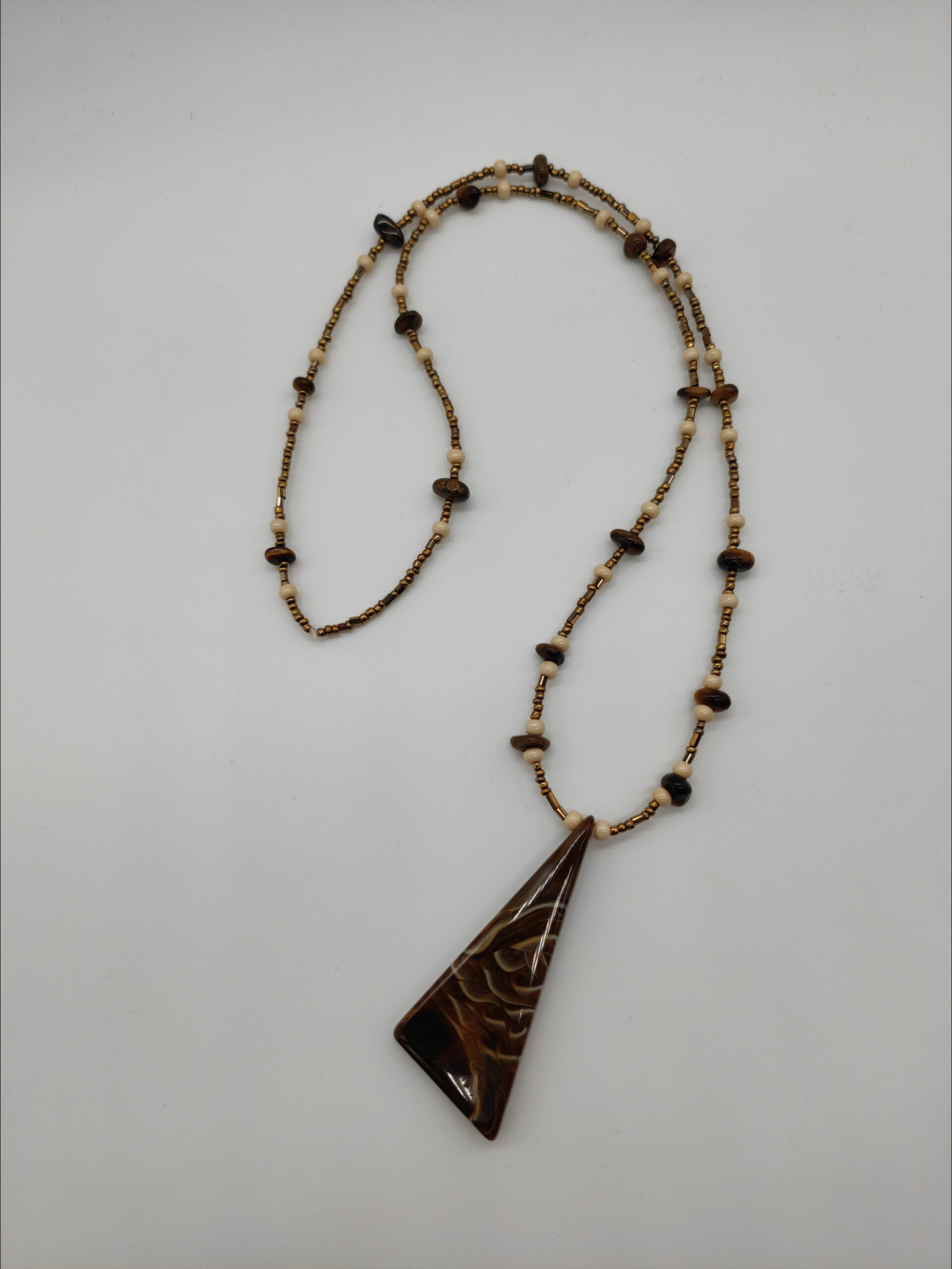 Collar largo de resina, miyuki, y ojo de tigre.
