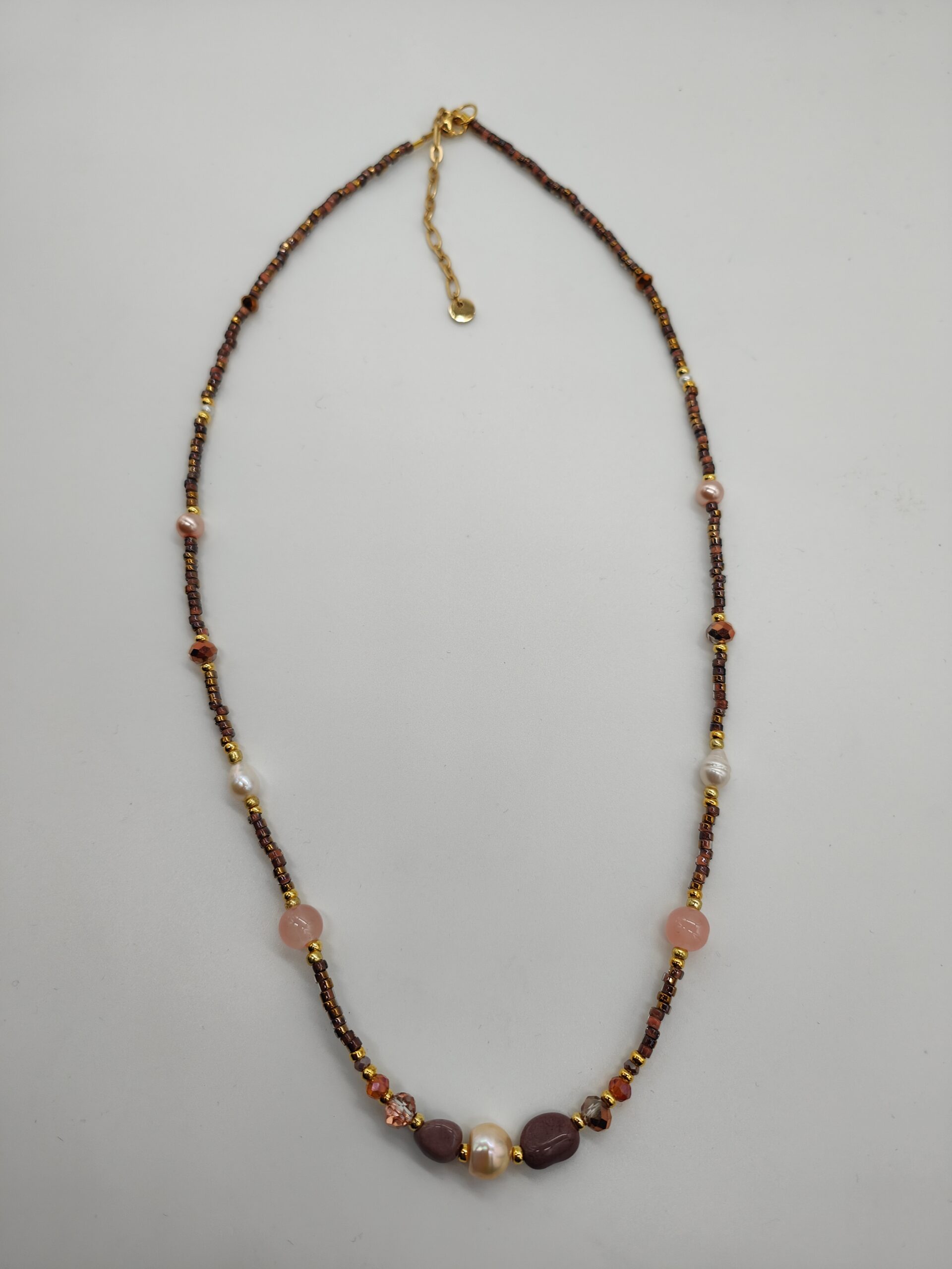 Collar corto piedras naturales, cuarzo rosa perlas y miyuki de cristal.