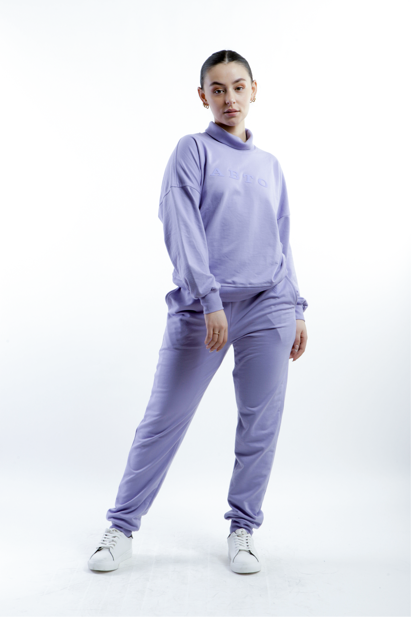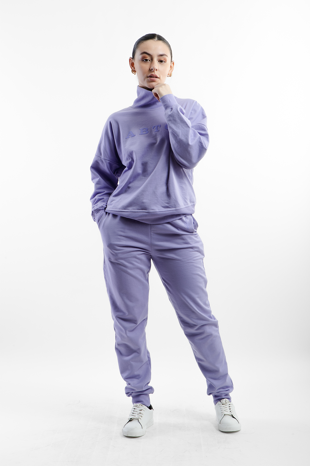 Conjunto deportivo mujer en tela burda 65% poli y 35% algodón con estampado: buzo «ABTO» tono a tono y en pantalón «pino» delantero superior izquierdo; puños y cuello en RIB; cierre de pantalón con cordón; marquilla, talla, bandera y etiqueta 100% eco.