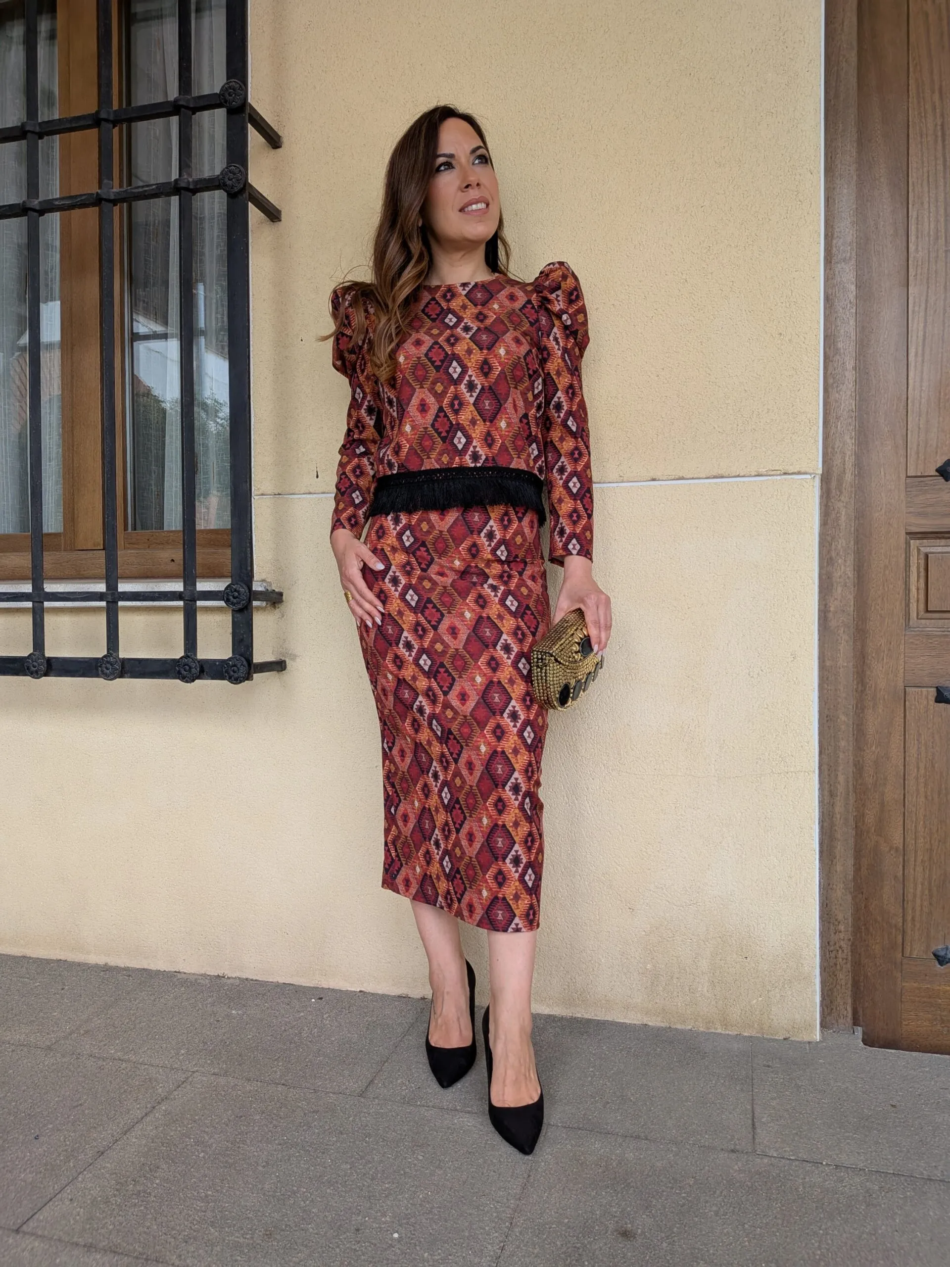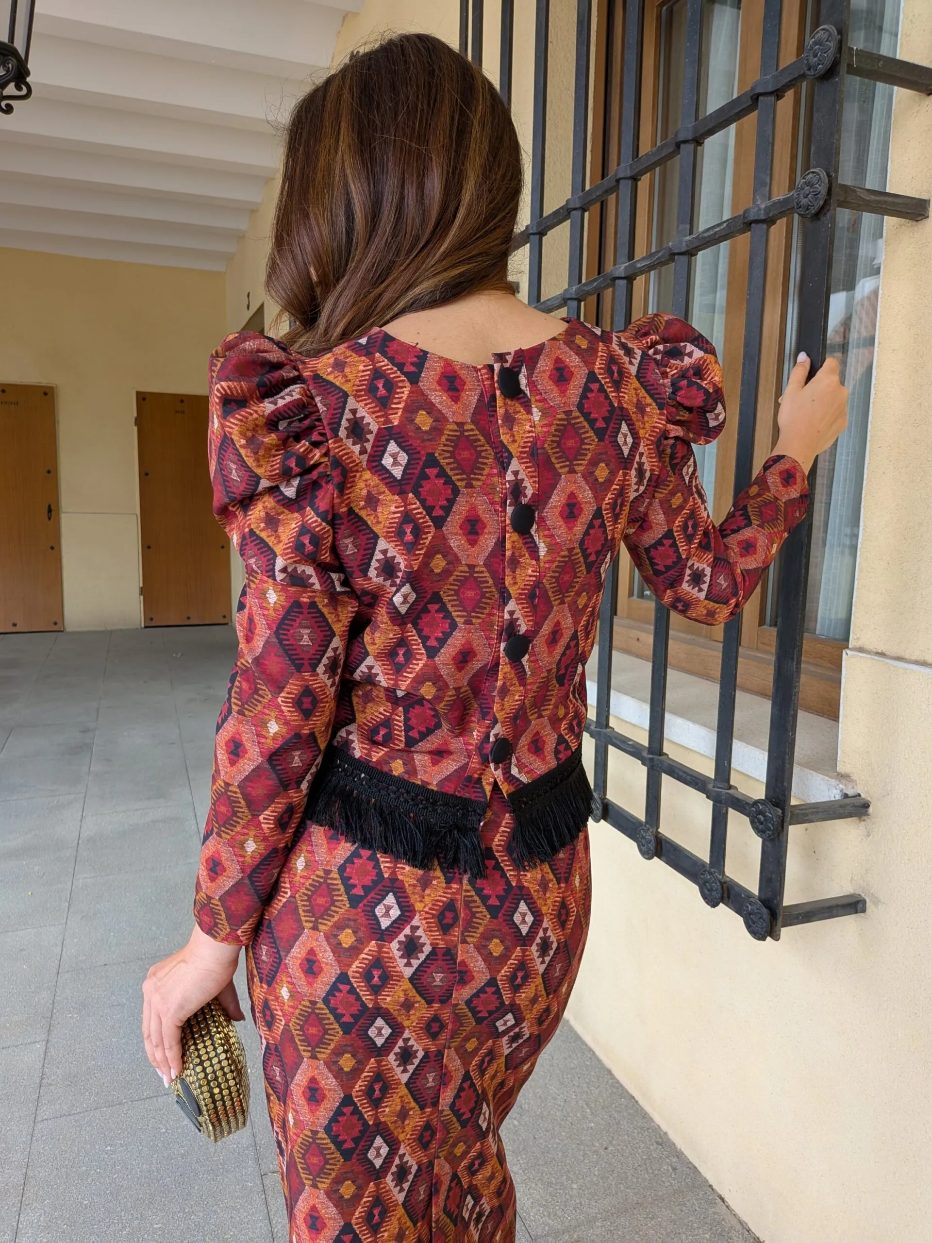 Conjunto de falda y top. Falda midi con cremallera trasera y top de manga larga con acabado en flecos. Detalle de cierre con botonadura.