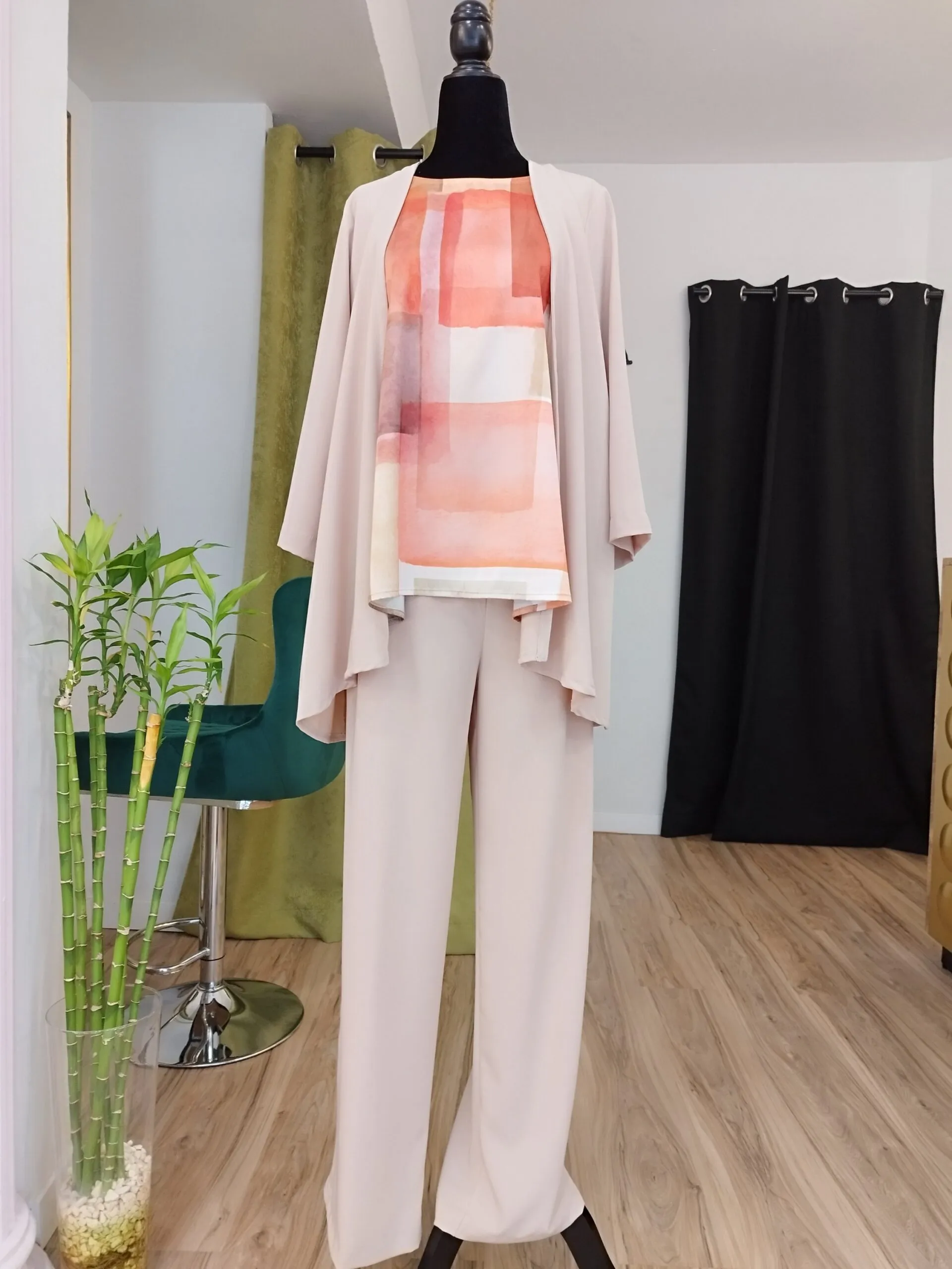 Conjunto de pantalón y kimono. Pantalón de corte recto engomado en cintura con bolsillos. Kimono de manga francesa. Fabricado en España.