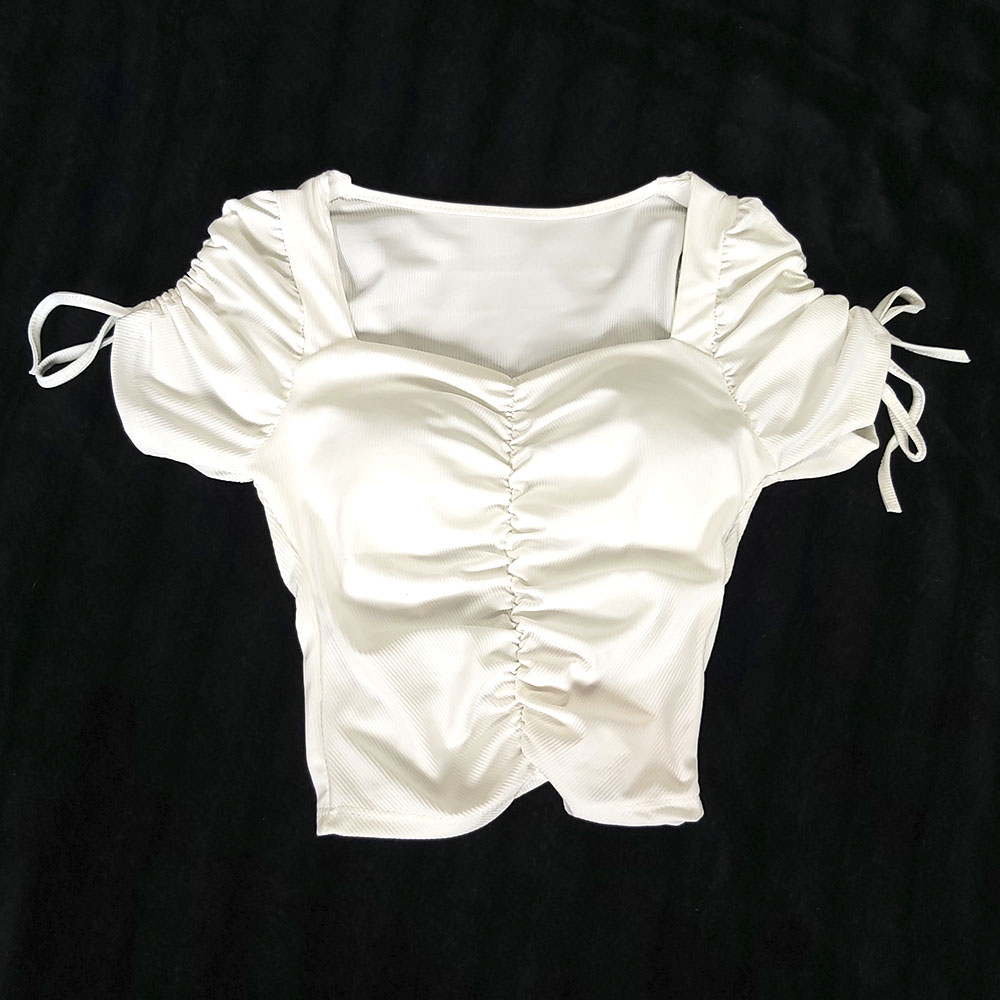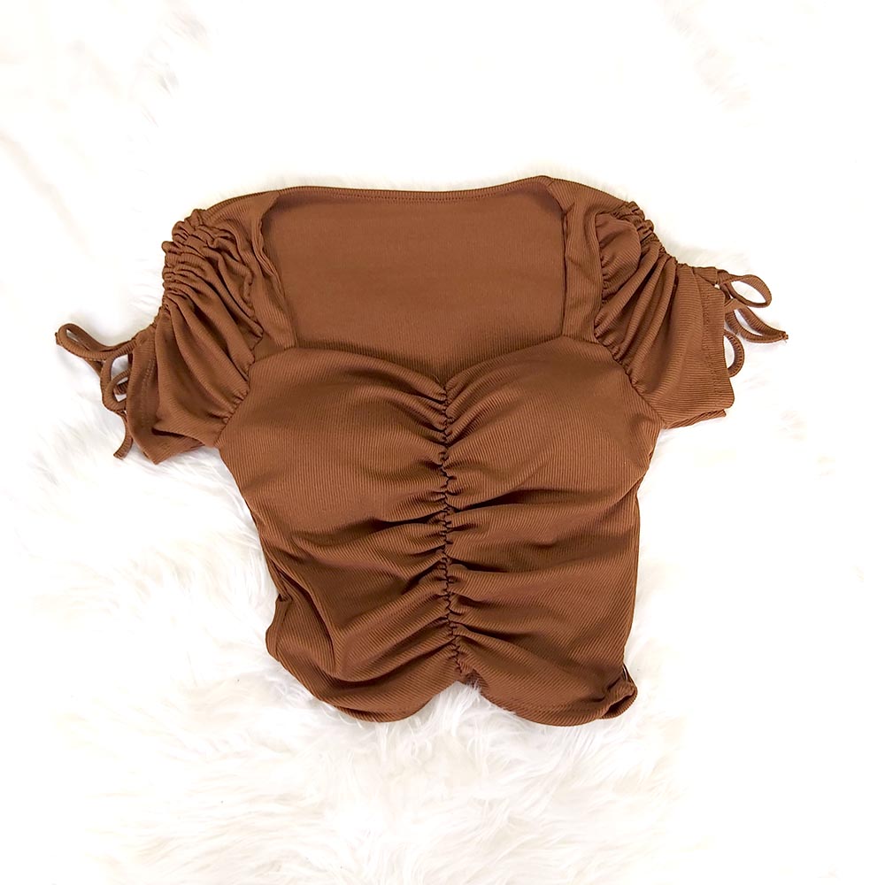 Presentamos este bonito top de canalé drapeado en tres diferentes colores con tiras en las mangas.