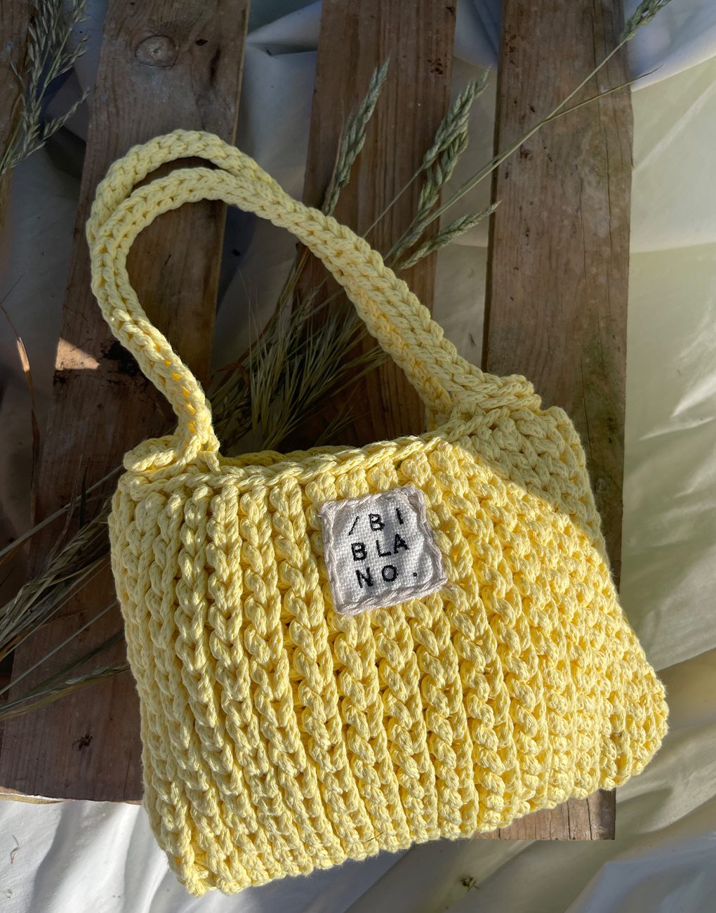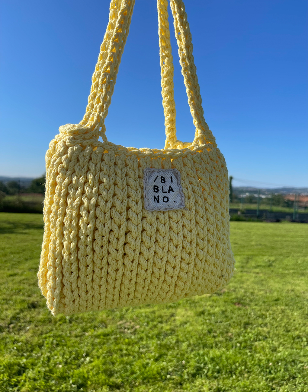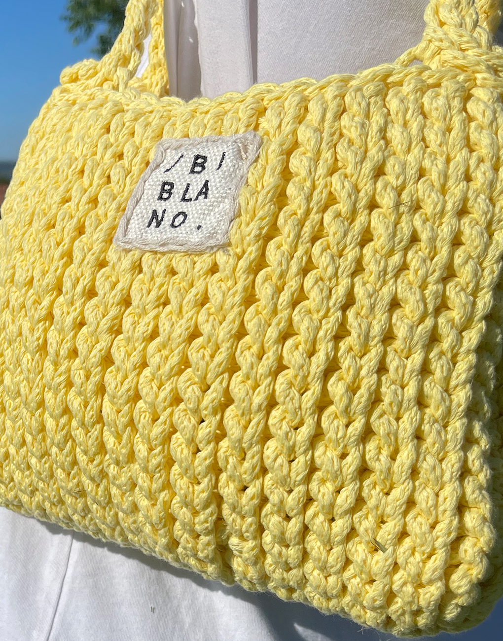 El bolso Crochet bag SENSE está realizado a ganchillo con fibra de algodón 100% reciclado. Todo hecho a mano desde Asturias.
