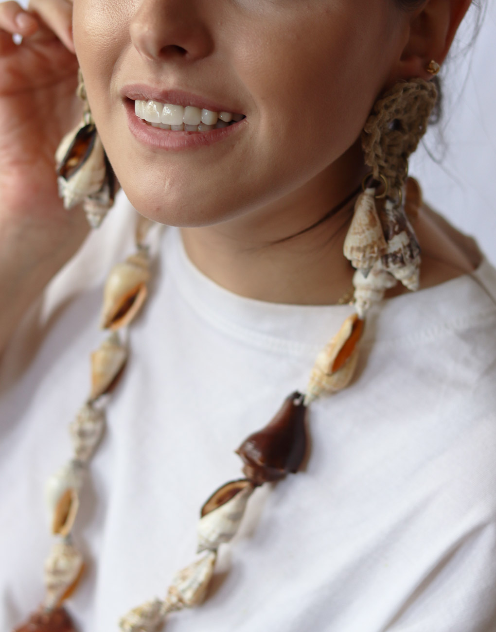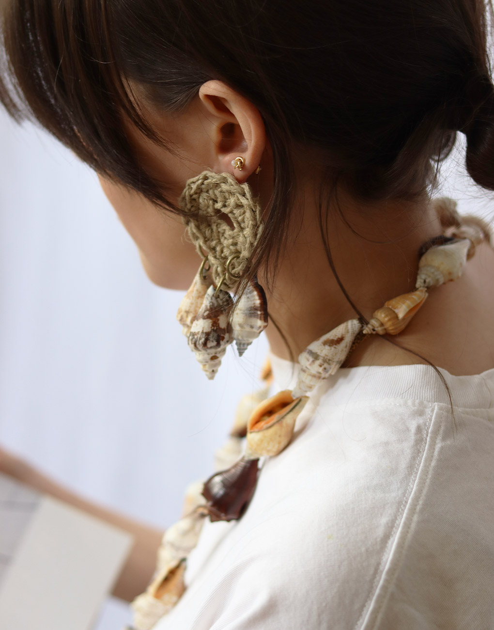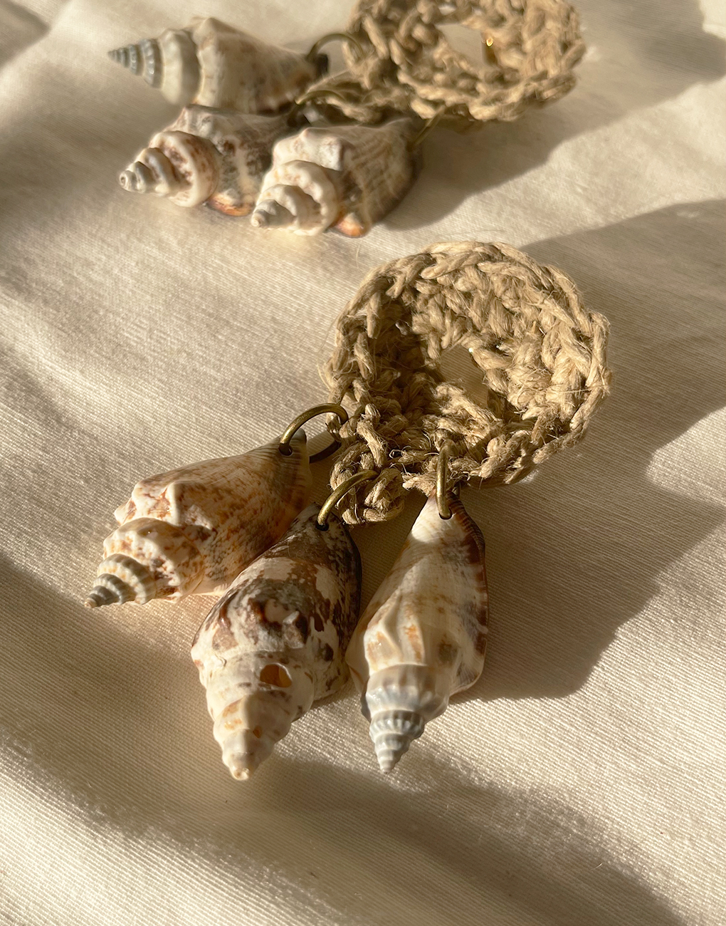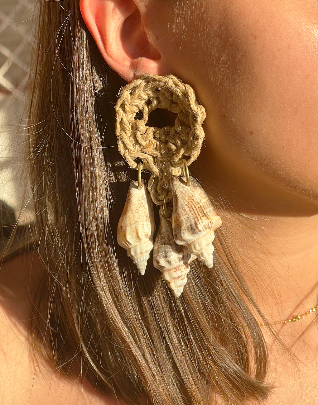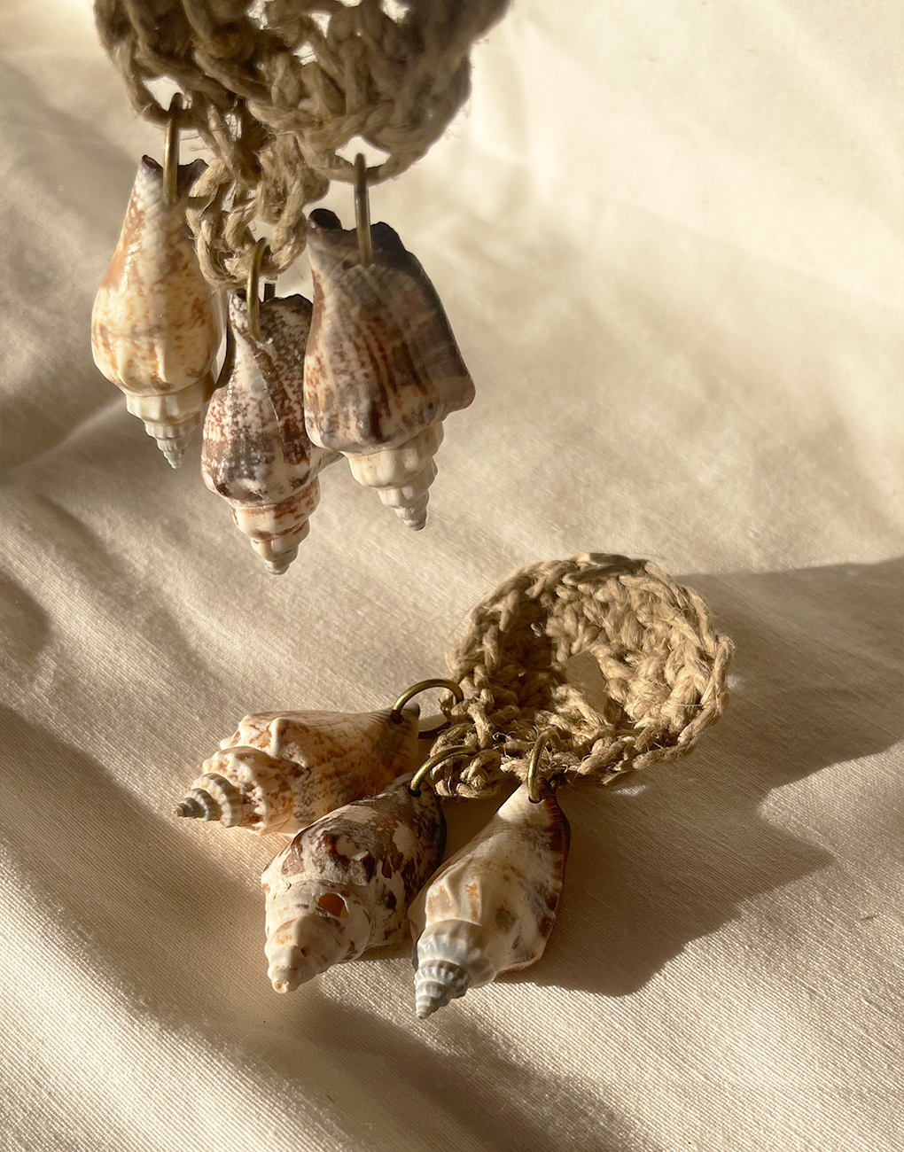 Los pendientes Crochet earrings SEAHEMP están realizados a ganchillo, concha natural, hechos de fibra de YUTE, esta fibra crece prolíficamente con poca agua y sin pesticidas. Eso hace que sea una de las fuentes para elaborar tejidos más respetuosa con el medio ambiente. Todo realizado a mano desde Asturias.