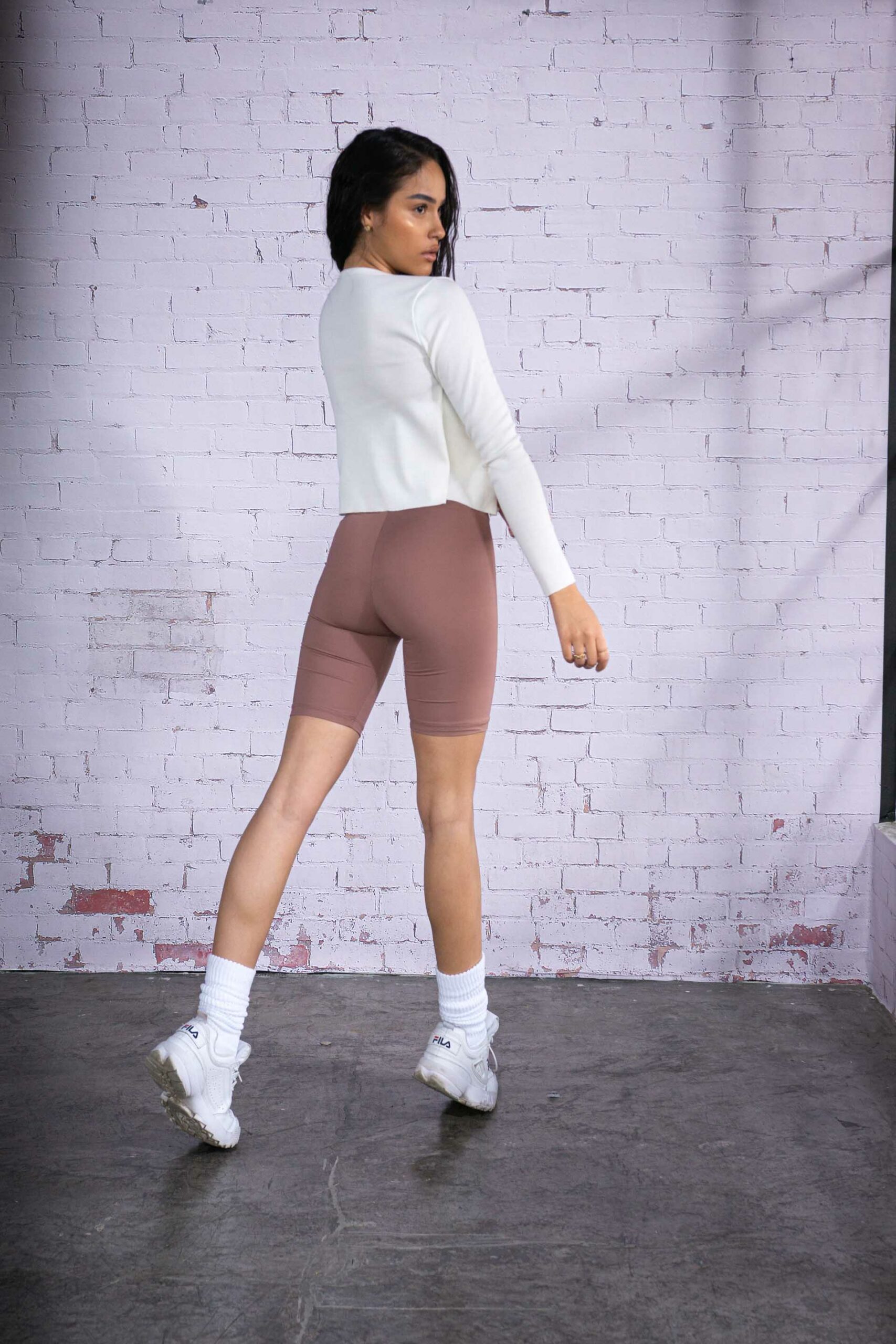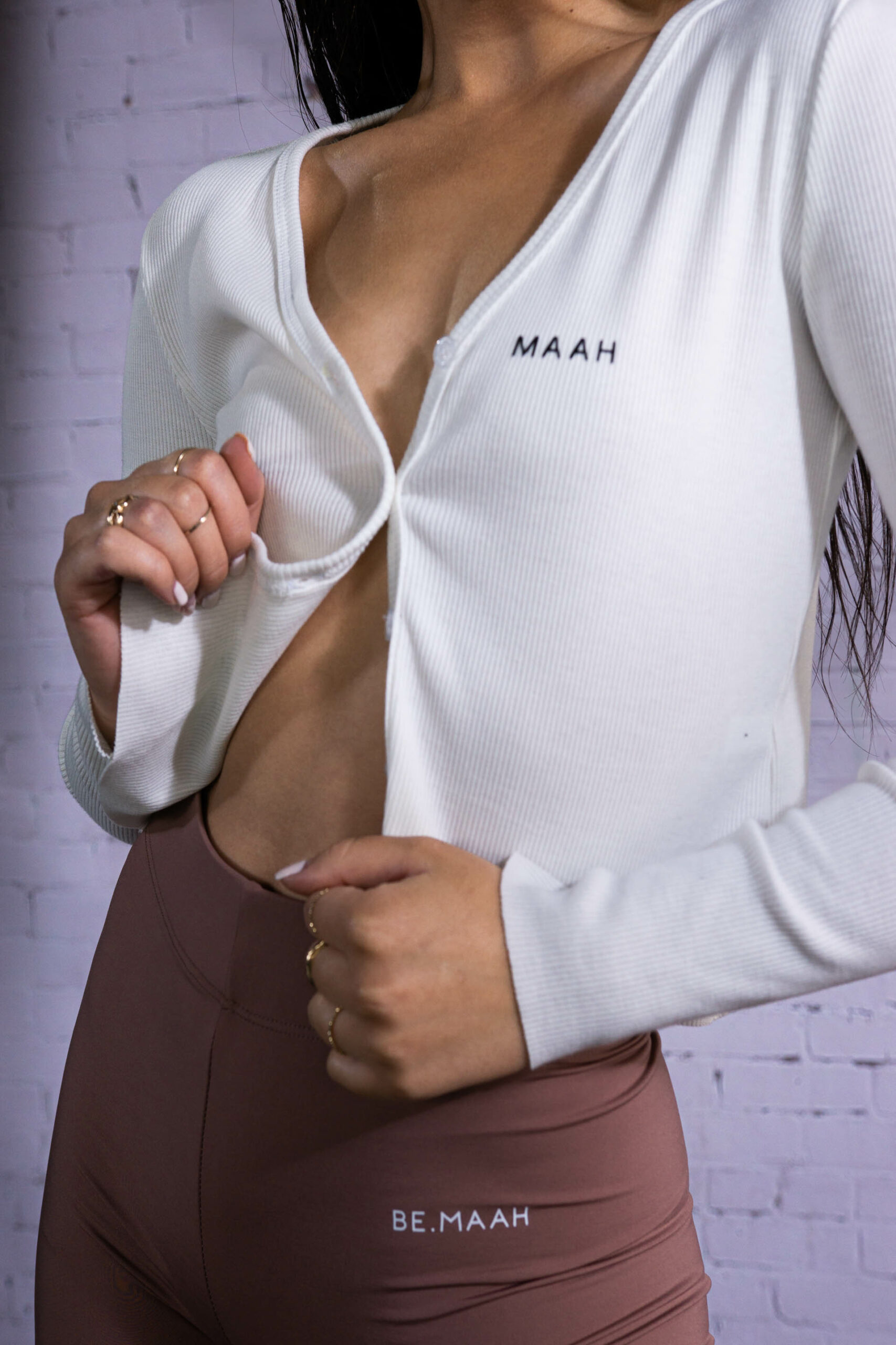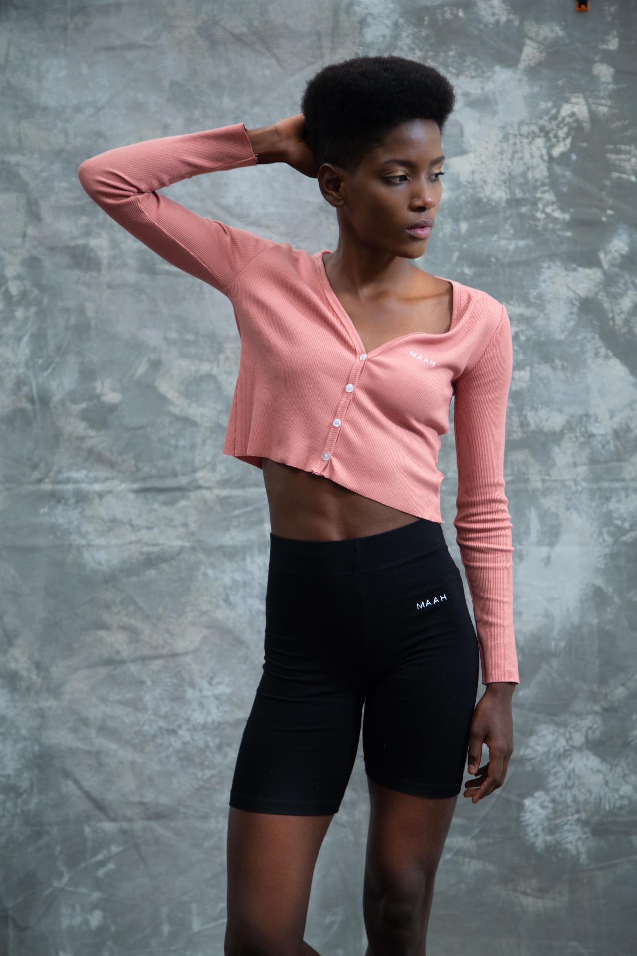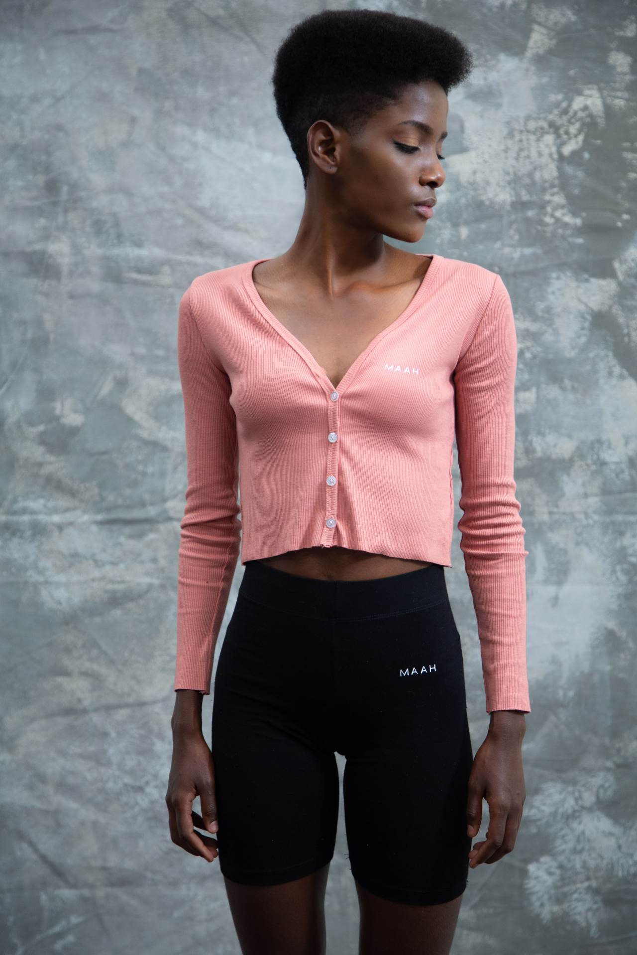 Blusa corta, manga larga, cuello en V con cierre de botones en rib licrado.