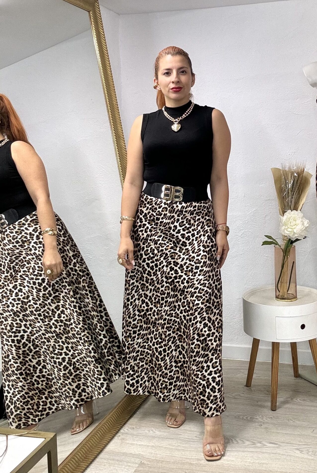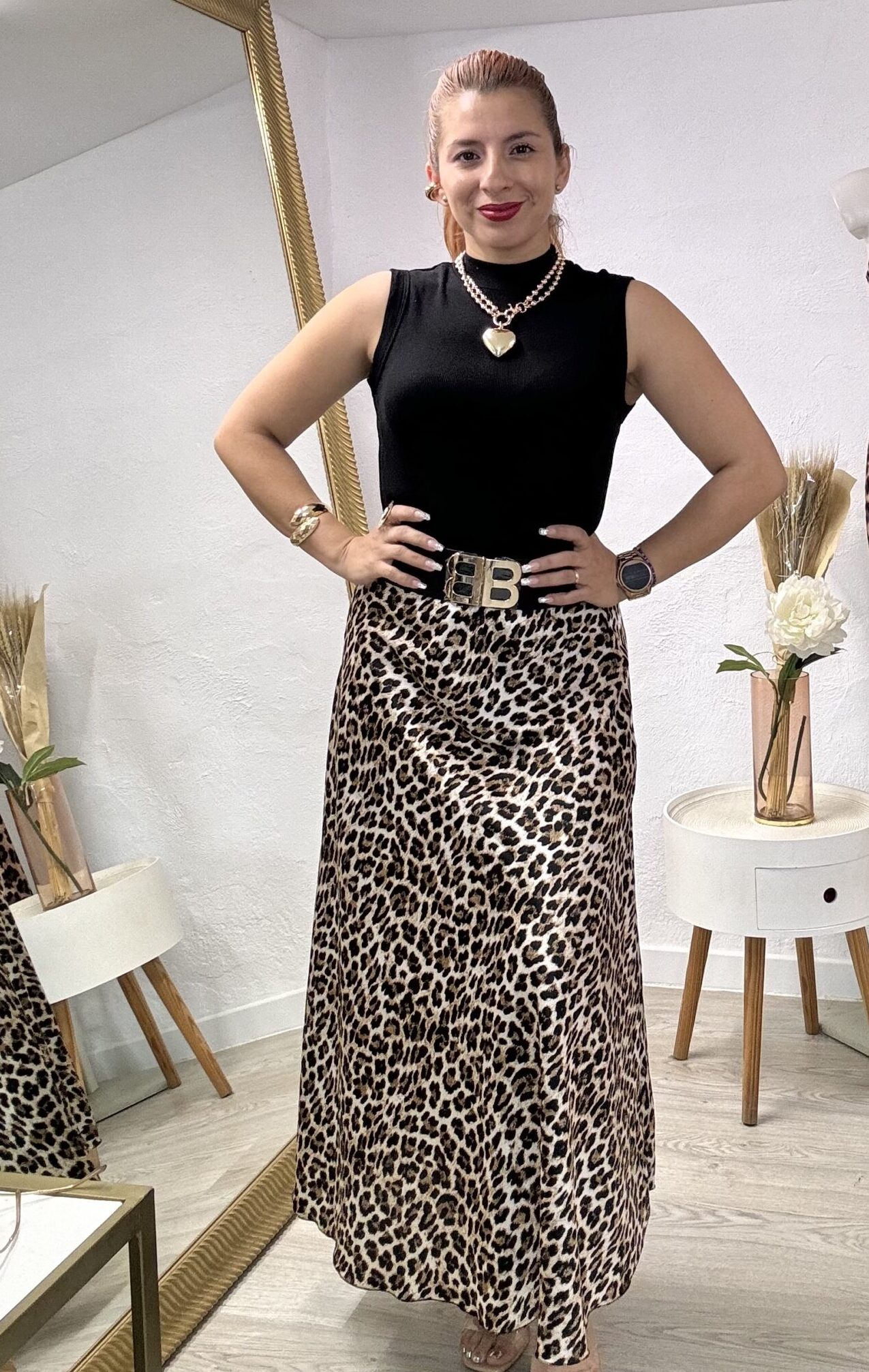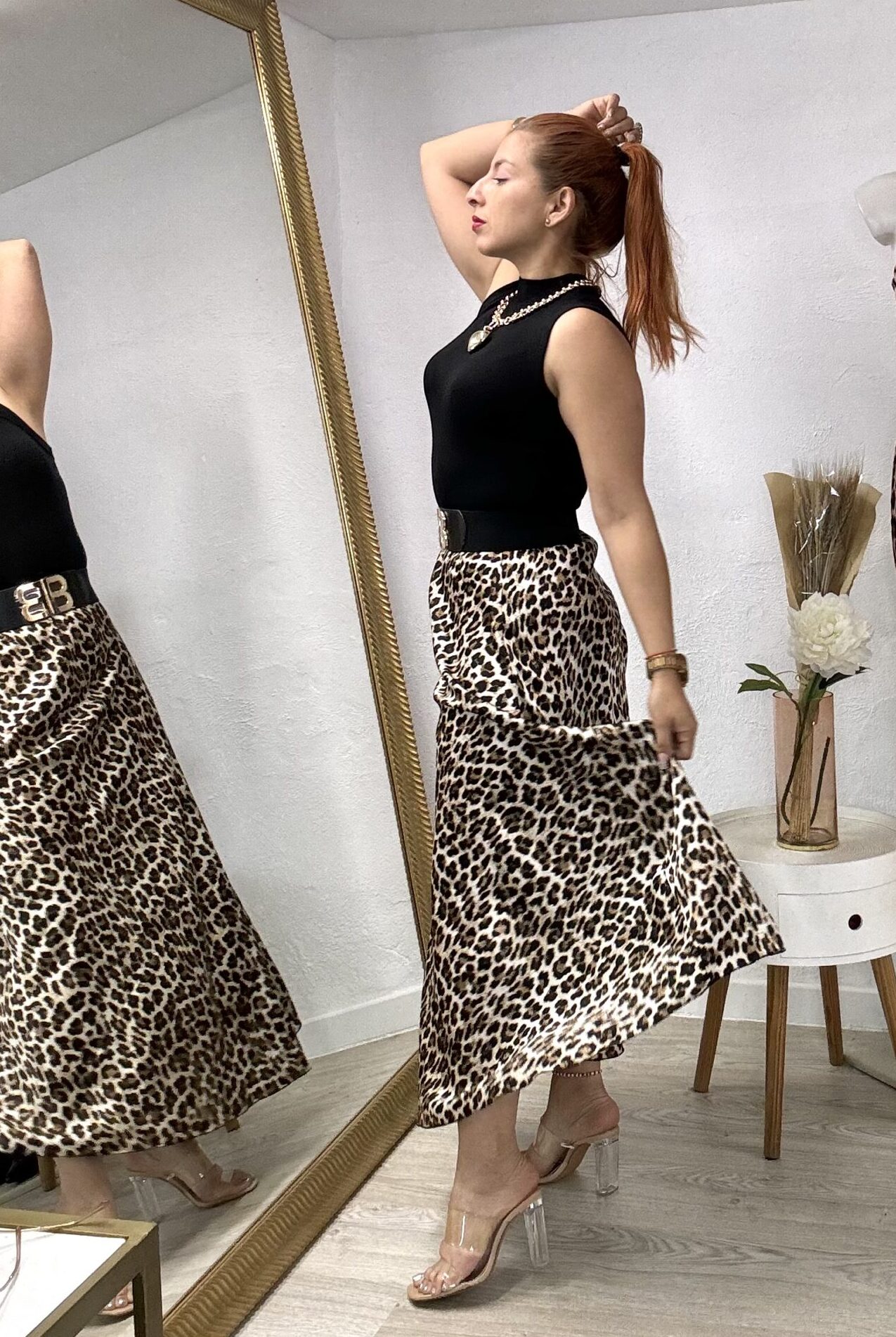 Falda midi talle a la cintura, con estampado animal print confeccionada con poliéster 100% efecto satén. Cinturilla de la falda elástica. Producto italiano.