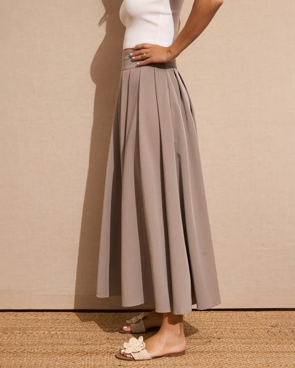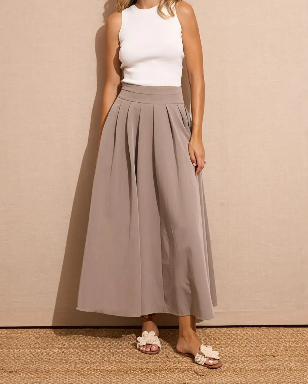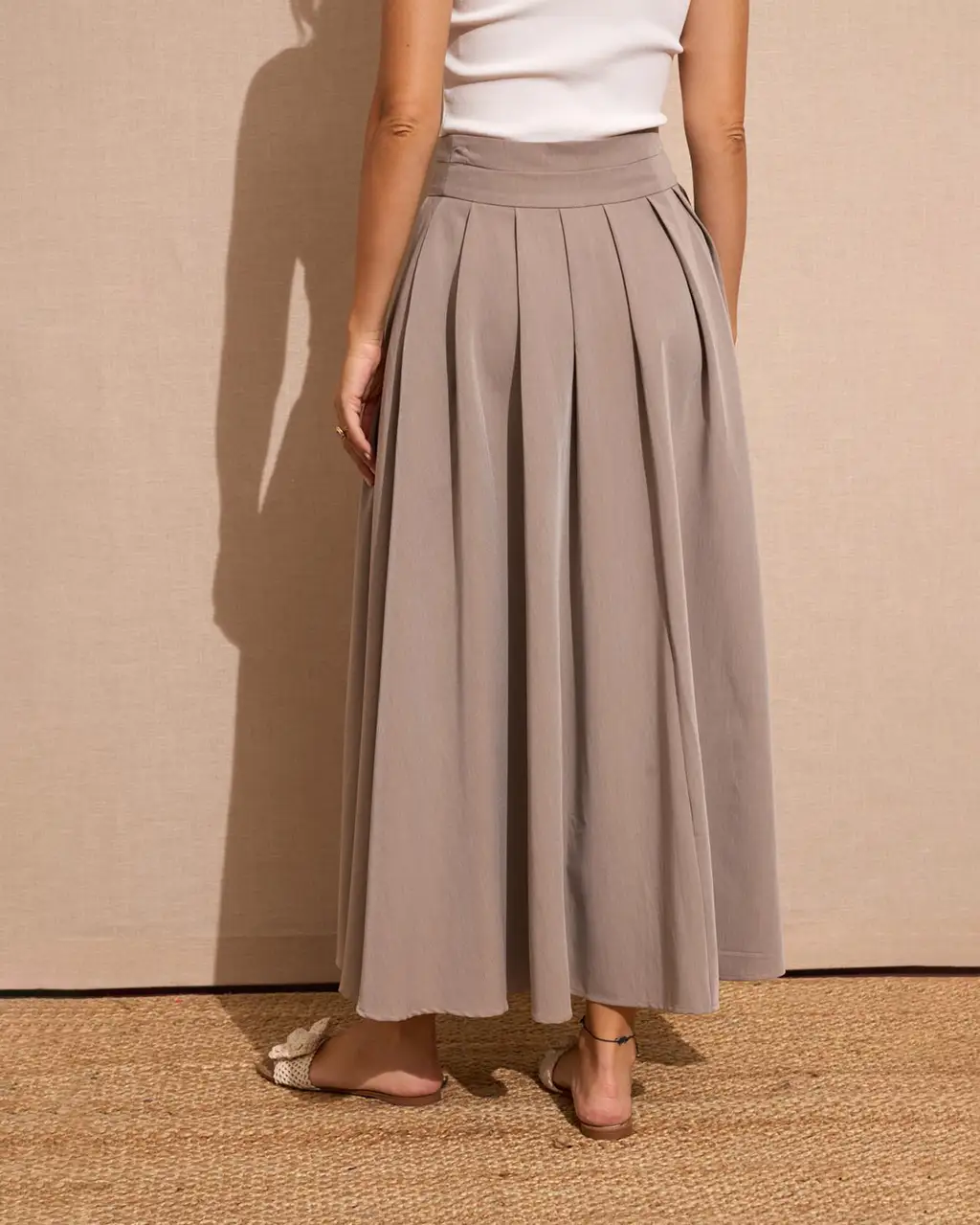 Falda larga tablas disponible en color topo y en diferentes tallas. Muy cómoda y fácil de combinar.