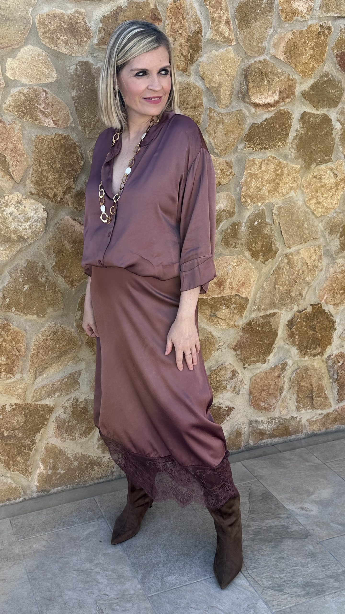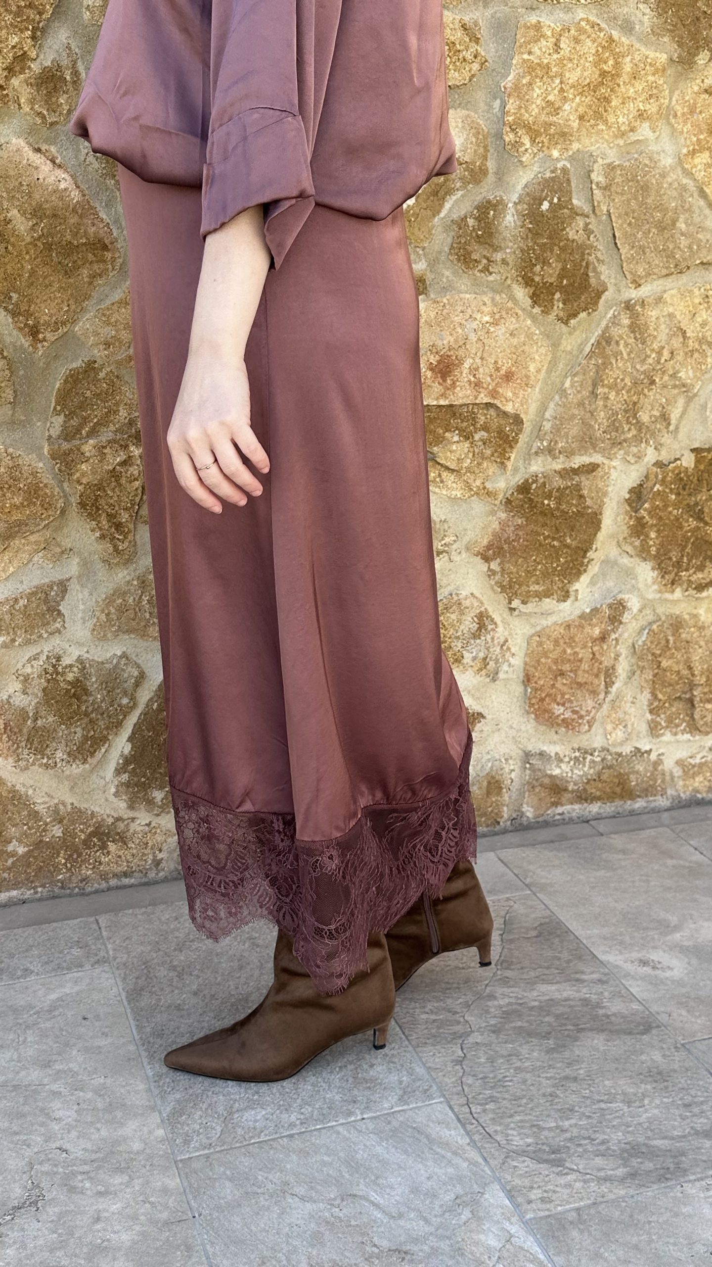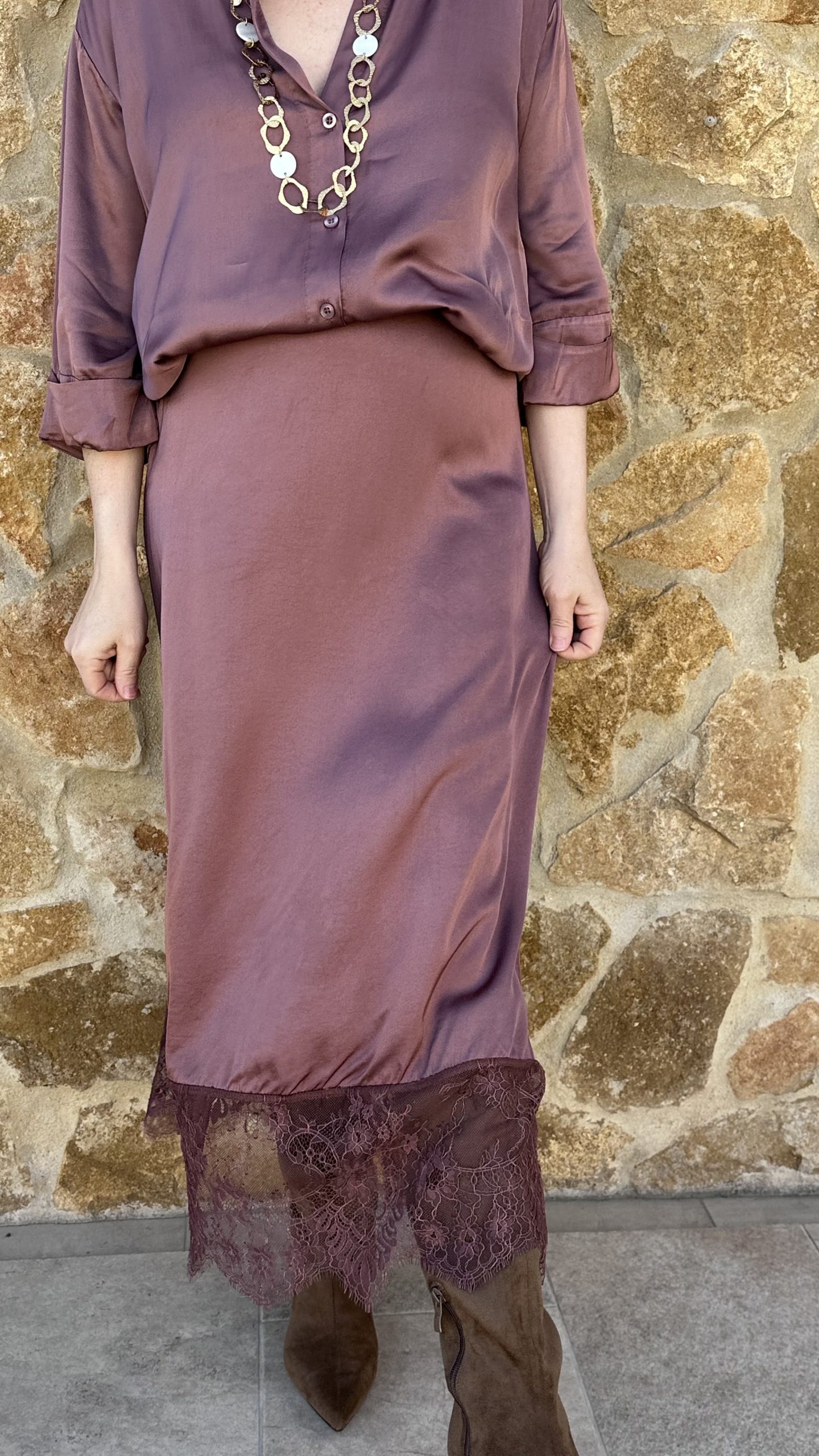 Falda satinada encaje terracota