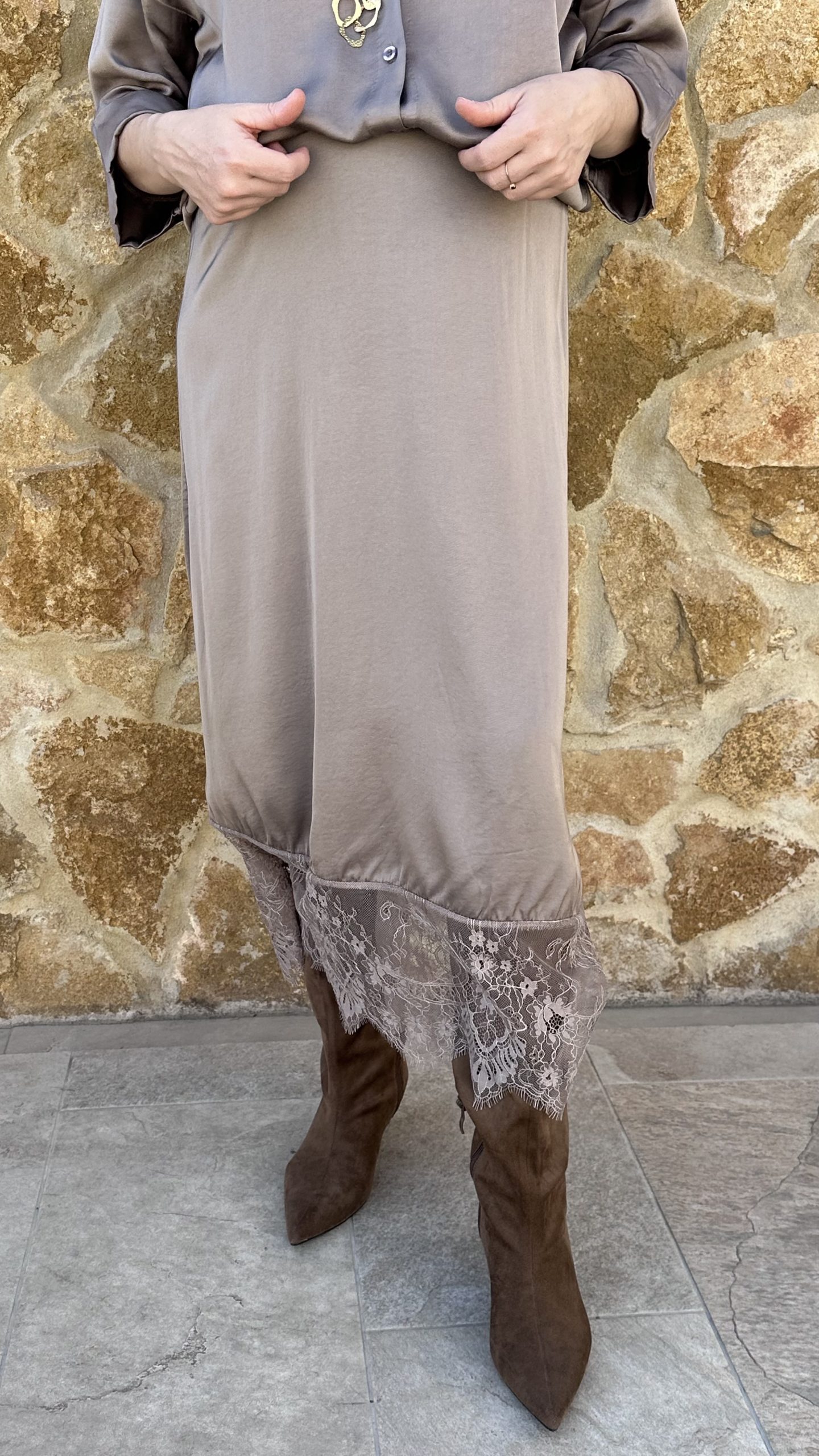 Falda satinada encaje topo
