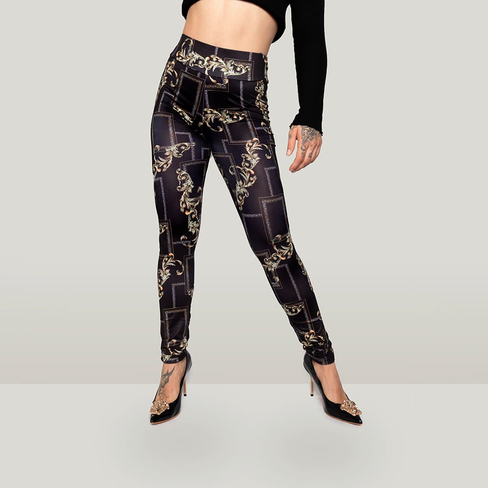 Nuestro leggins estampados Gianni, tienen un estampado barroco espectacular, por si no te atreves con los leggins versace, estos son similares pero más discretos ya que su color de fondo es negro y tiene dibujos en dorado.