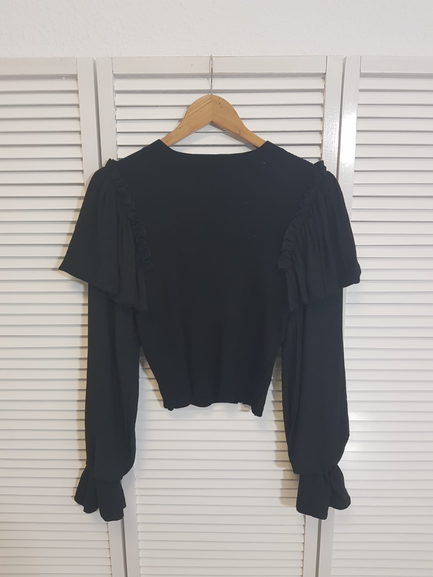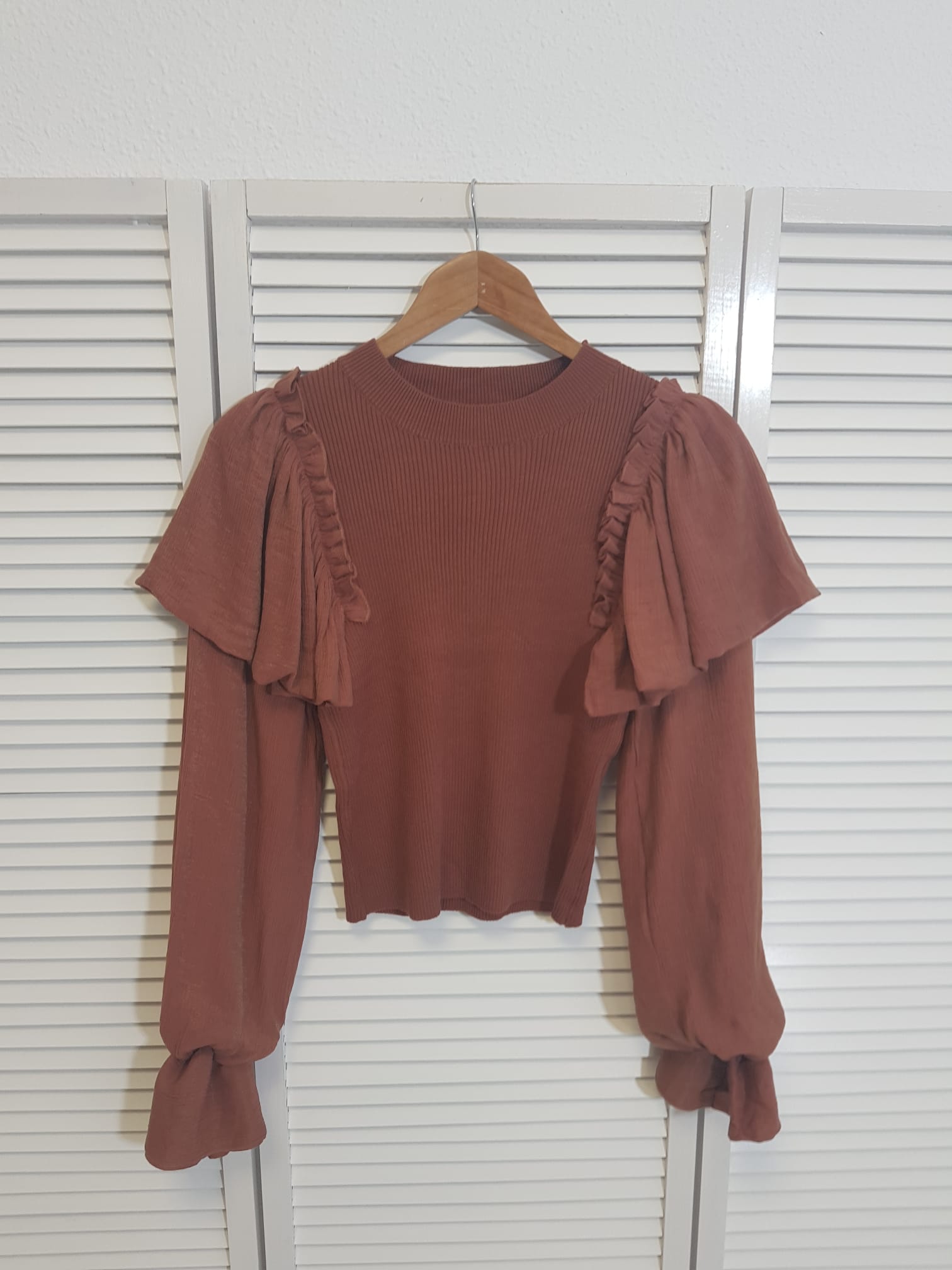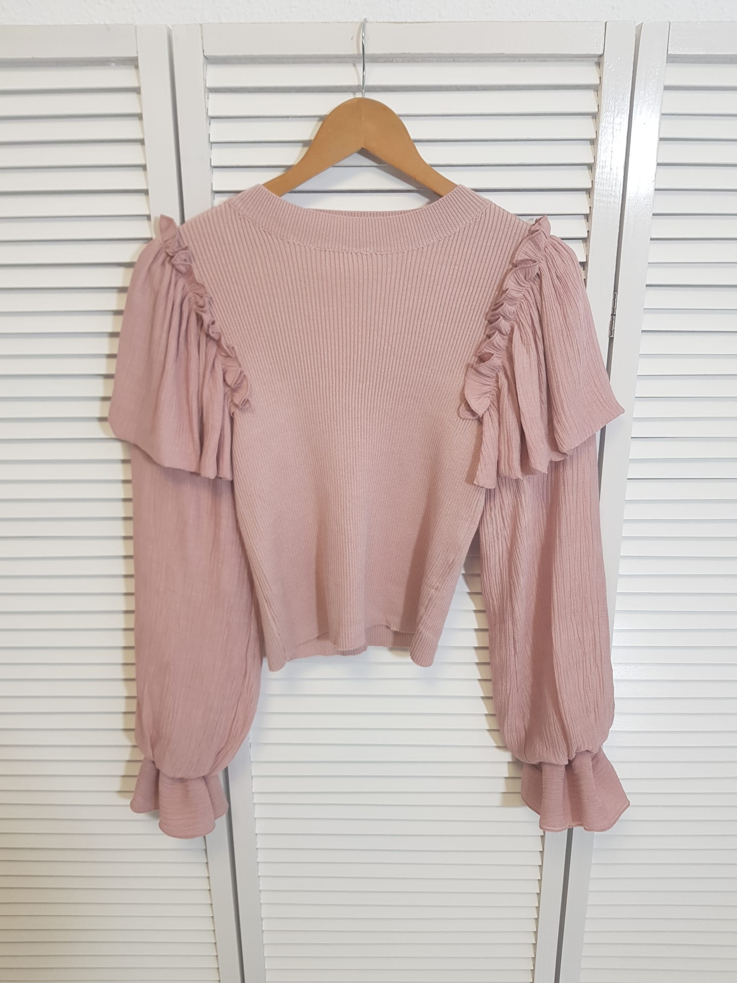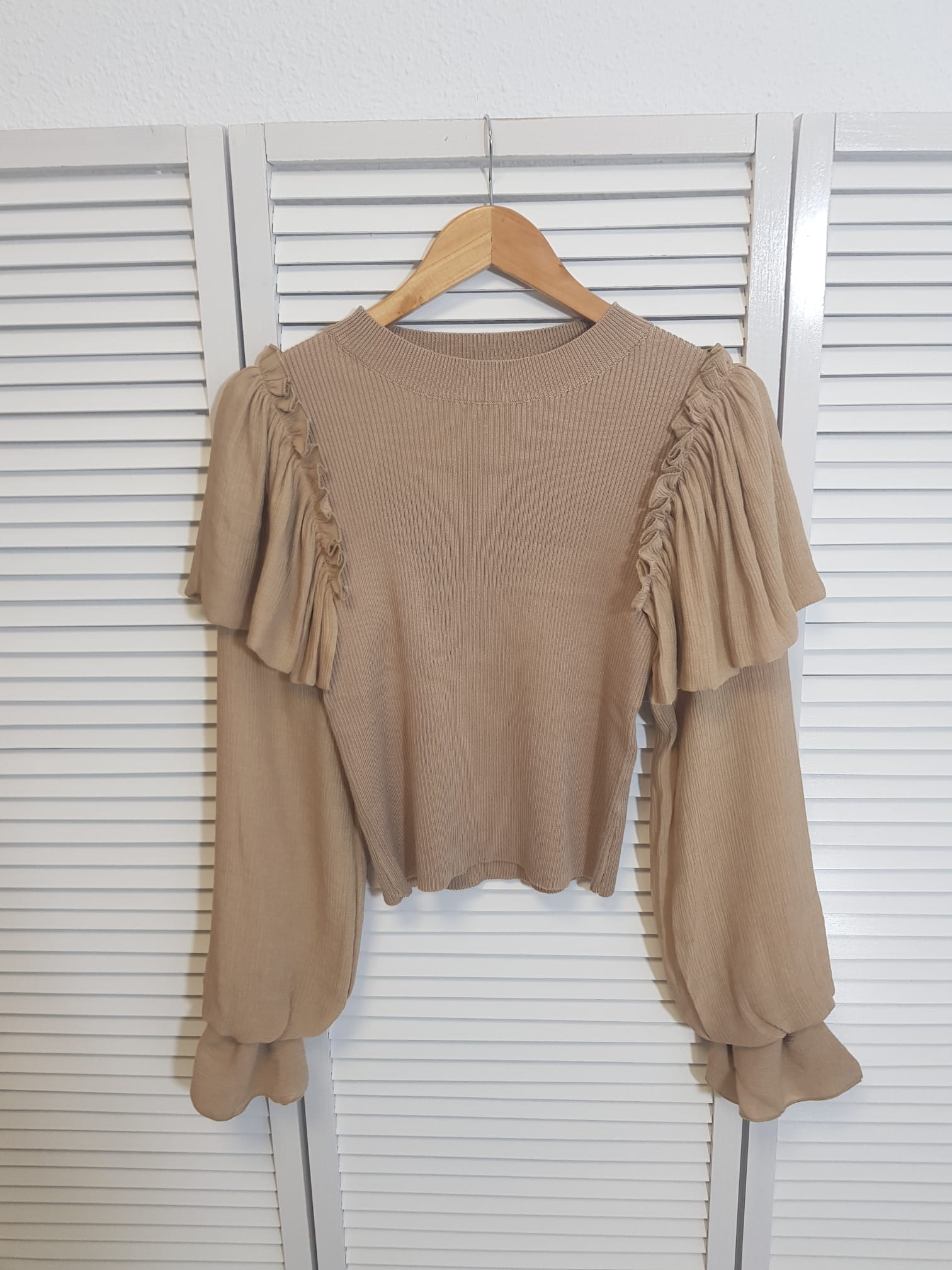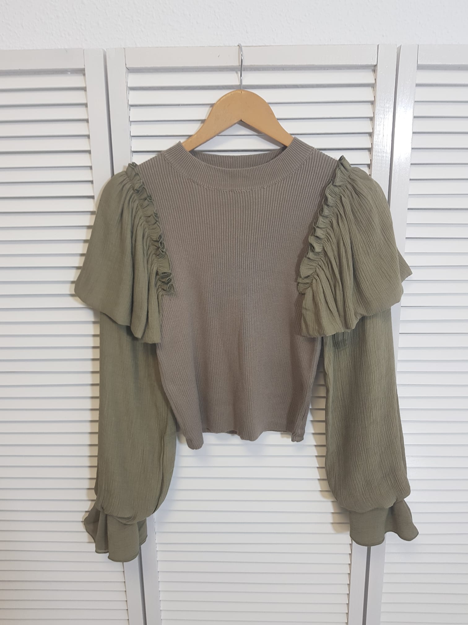 Jersey de canalé combinado con magas de tela.