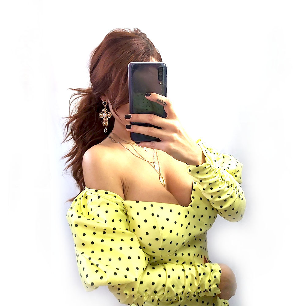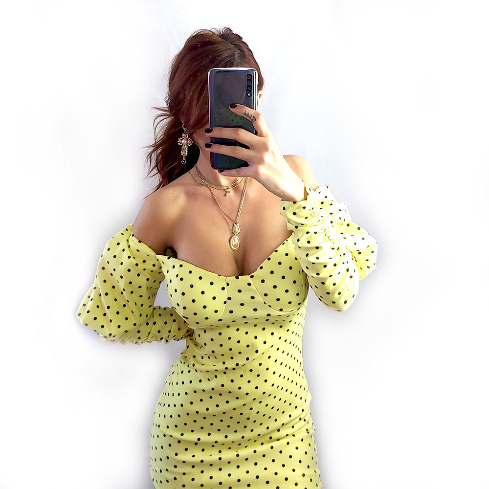 Vestido corto de lunares con manga abullonada y escote en forma de corazón con copas para realzar el pecho.