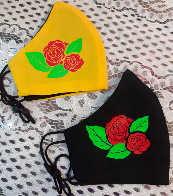 Mascarillas con telas certificadas, de algodón color negro y amarillo con forro de algodon y goma negra, dibujo del la rosa de Sant Jordi