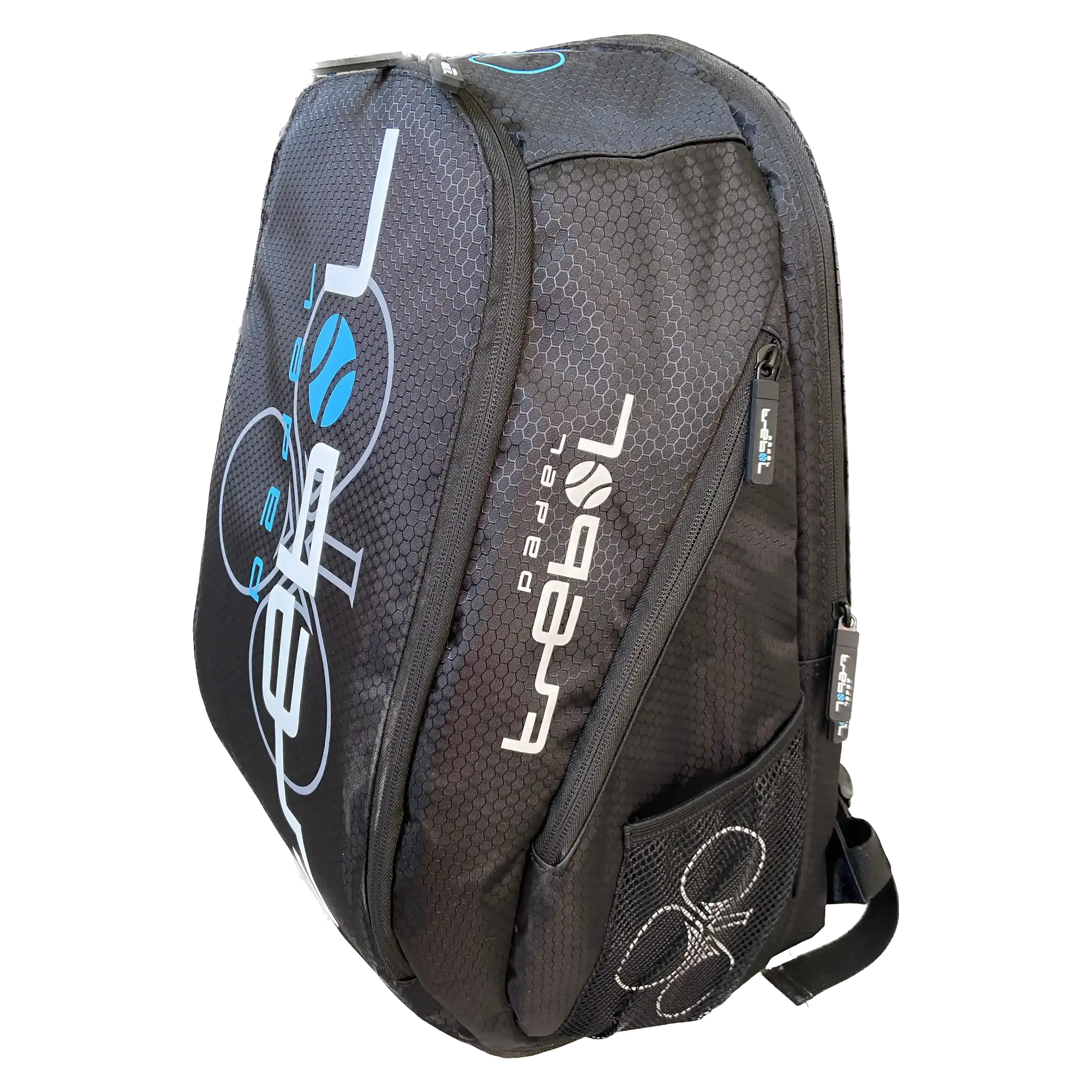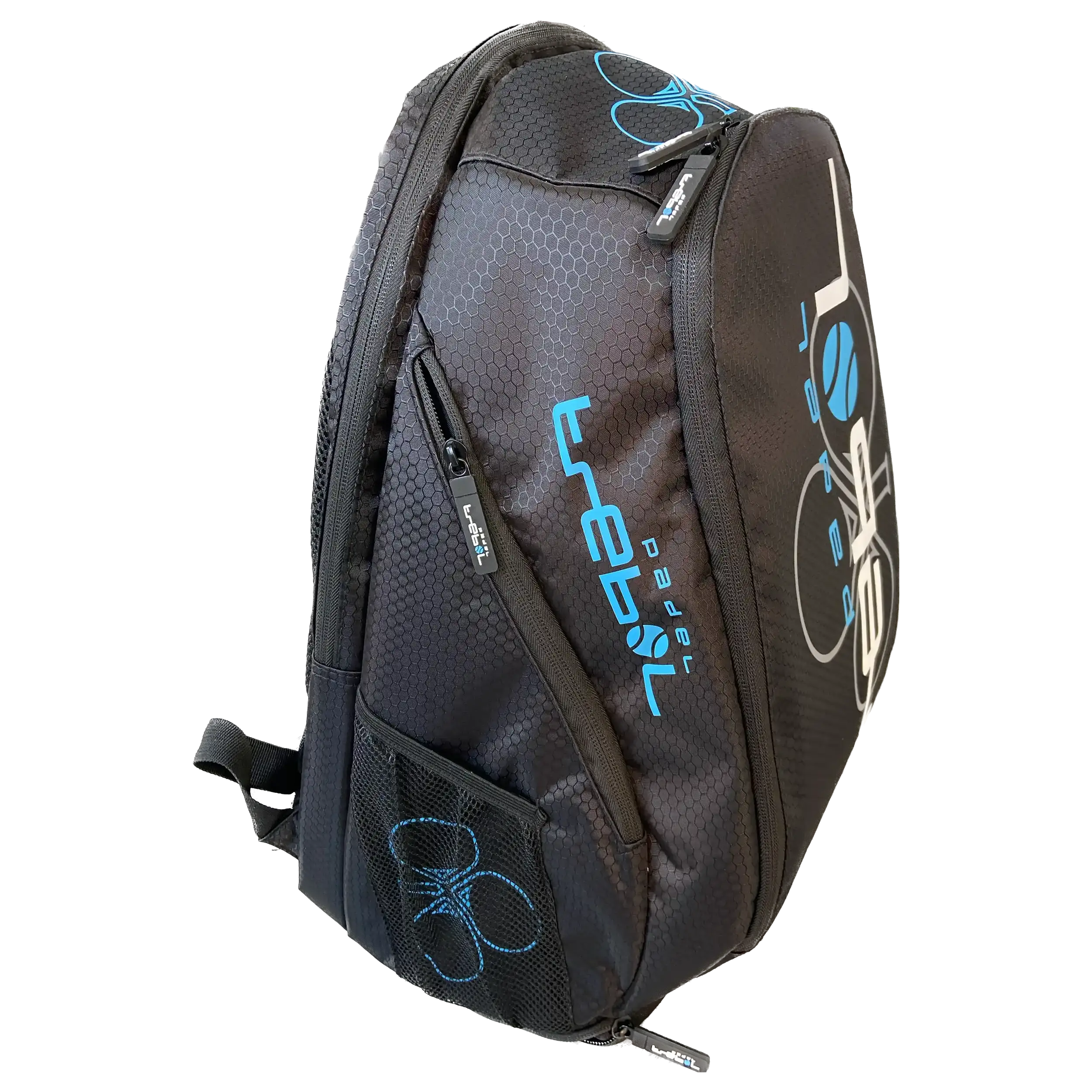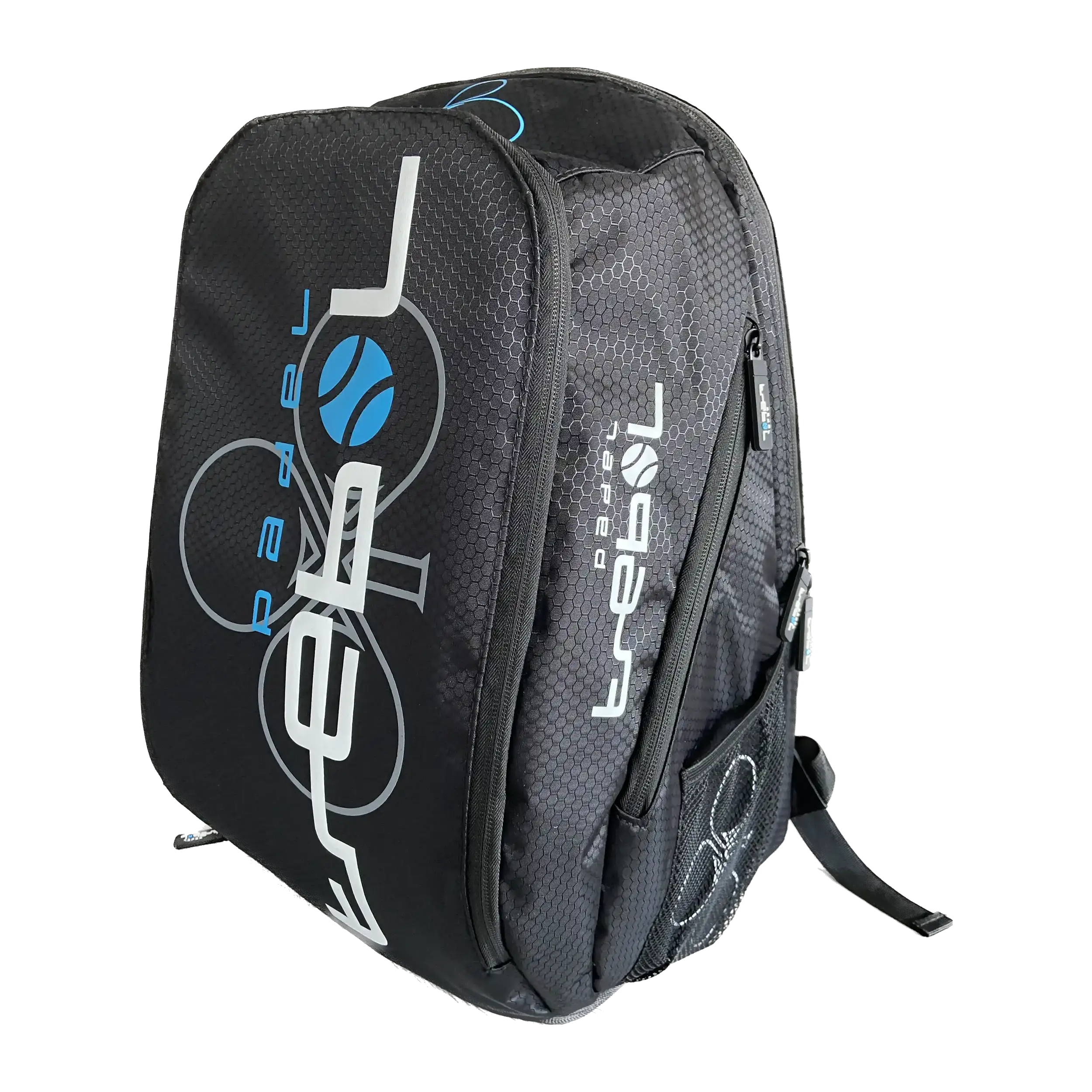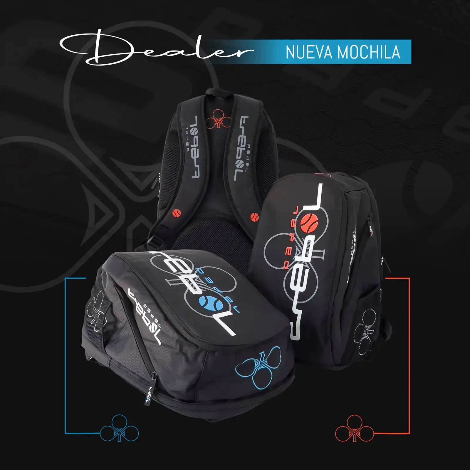 Nuestra mochila Dealer , una mochila de transporte , esta fabricada para guardar todo lo necesario para la parctica de padel , está fabricada en nylon resistente e impermeable, acabado negrohexagono brillo , caras distinto color en laterales .
