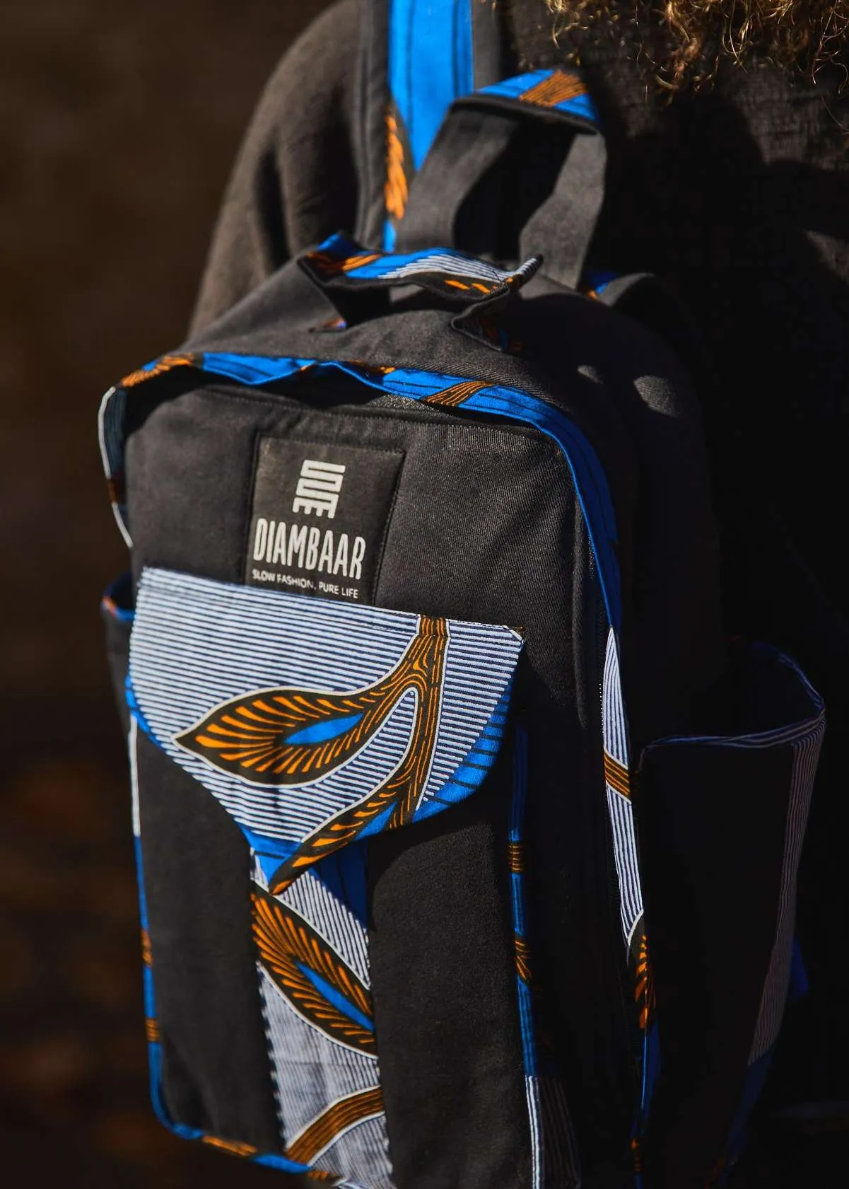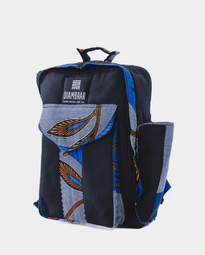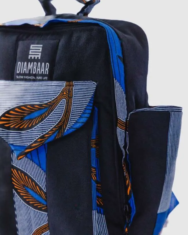 Mochila con fragmentos de tela wax multiusos con compartimiento múltiple y cremallera. Asas graduables.