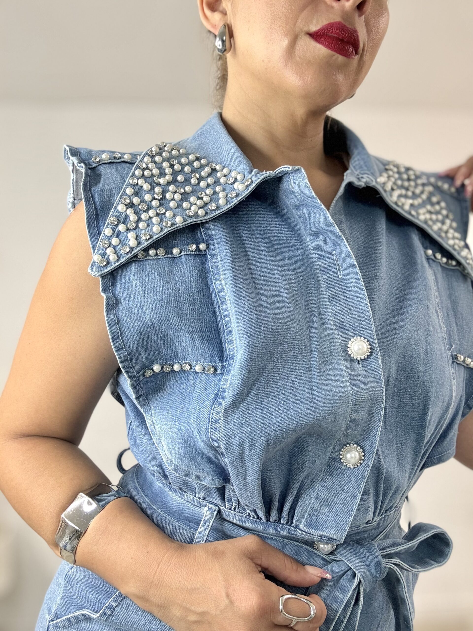Mono corto denim modelo Coquette con botones en forma de flor y cuello acabado en camisa con brillo. Cinturón para atar. Confeccionado en 90% nylon y 10% poliéster.