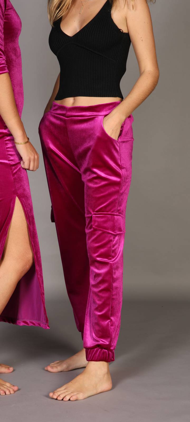 Pantalón cargo con goma en cintura, goma en tobillos y solapa a media pierna.