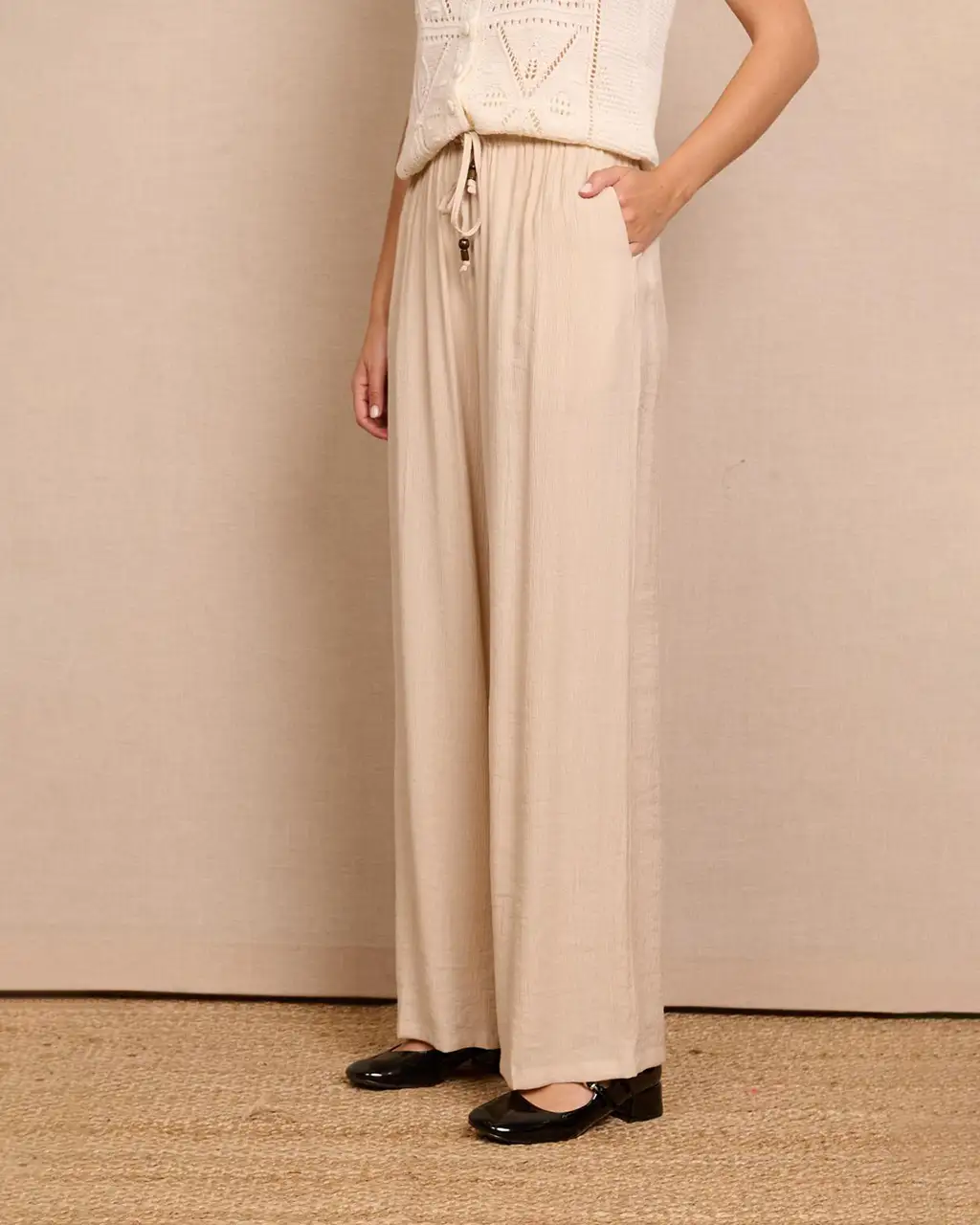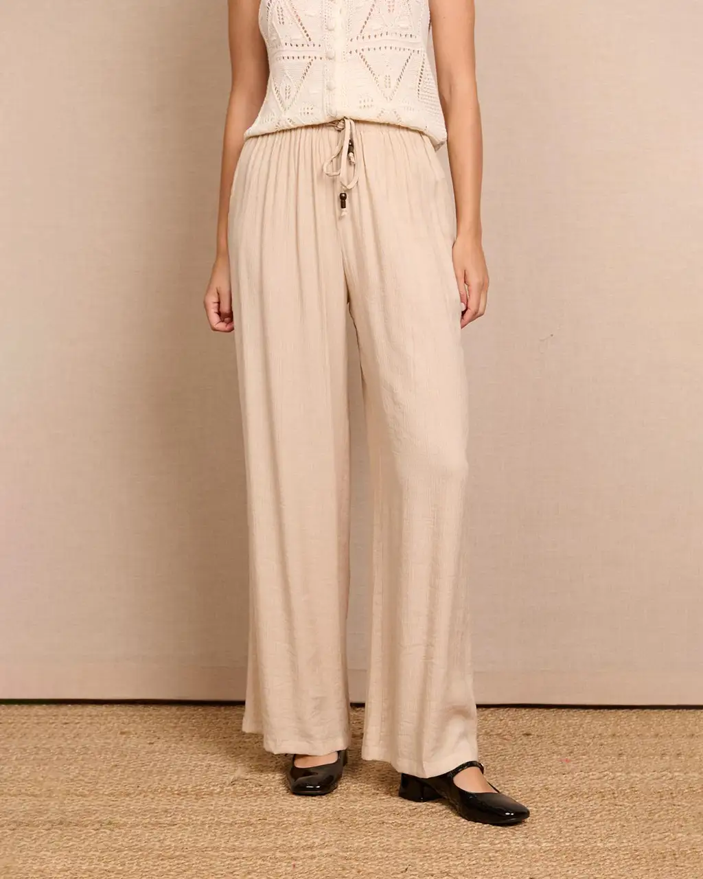 Pantalón largo tipo bambula, con cintura elástica con cordón, en color beige. Disponible en diferentes tallas.