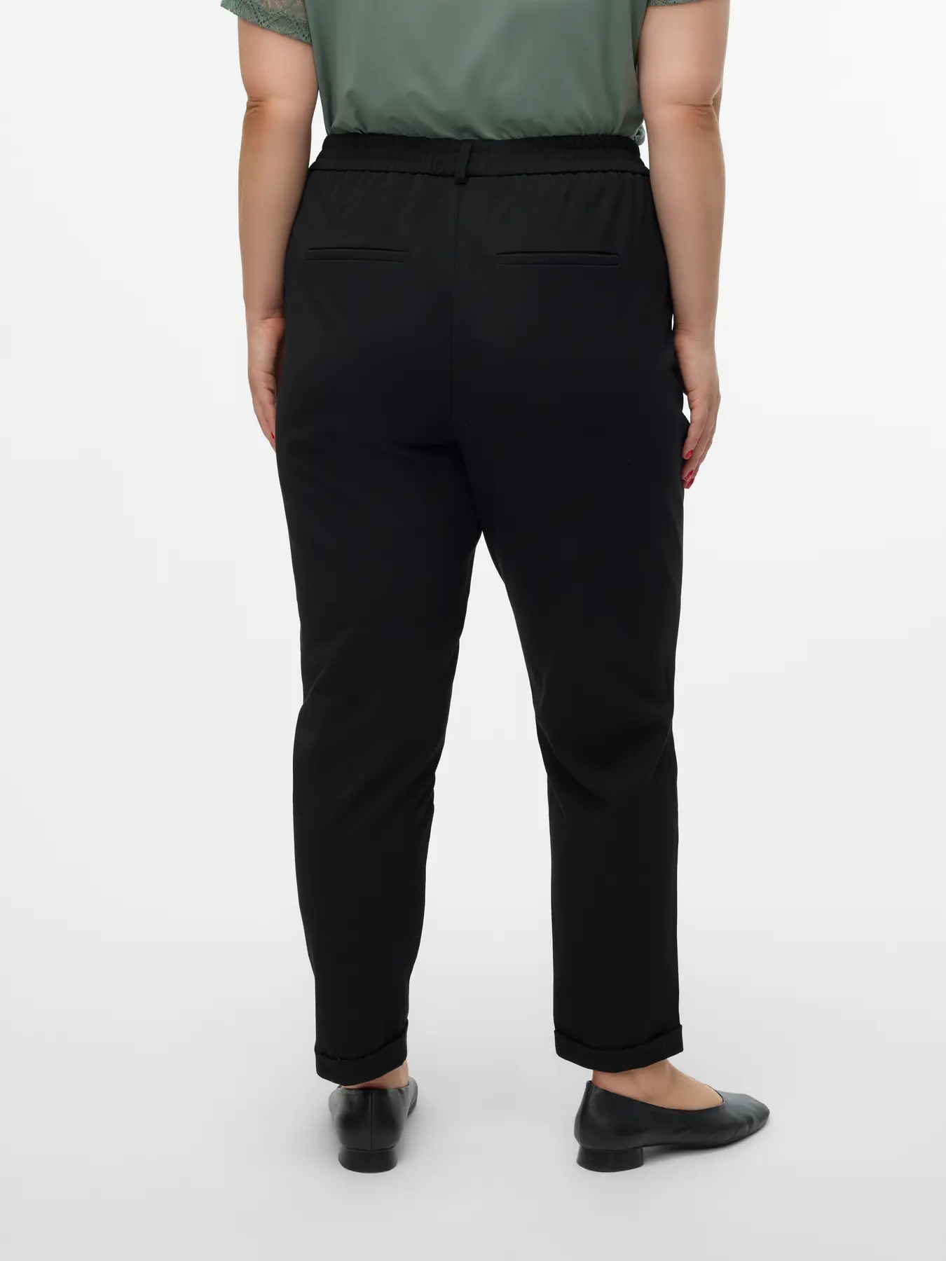con goma en parte trasera de la cintura, sin cremallera ni boton