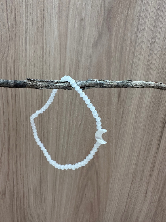 Pulsera elástica de bolitas blancas con luna de nácar.