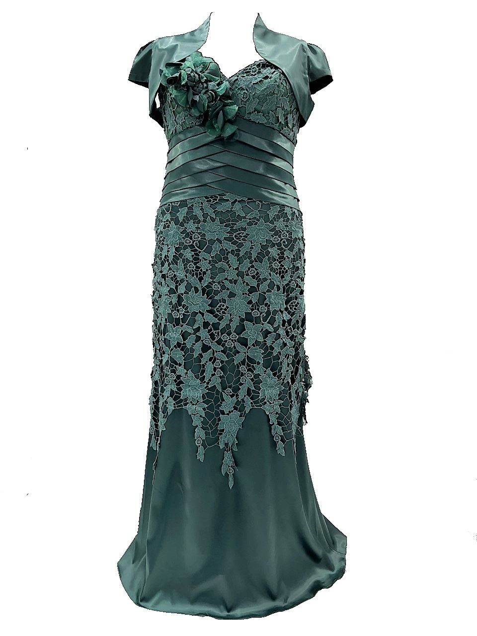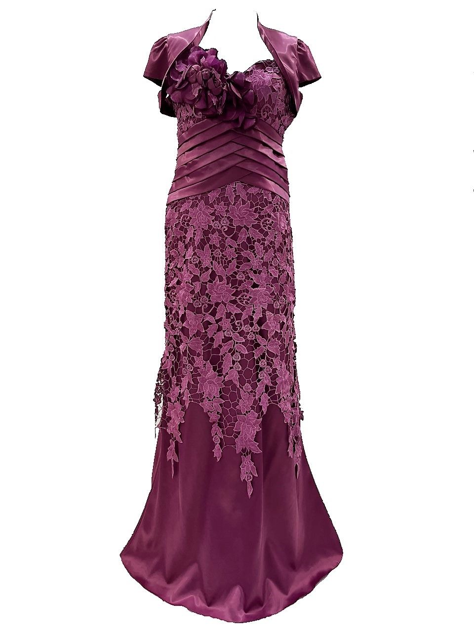 Vestido palabra de honor en raso grueso y guipur con bolero.