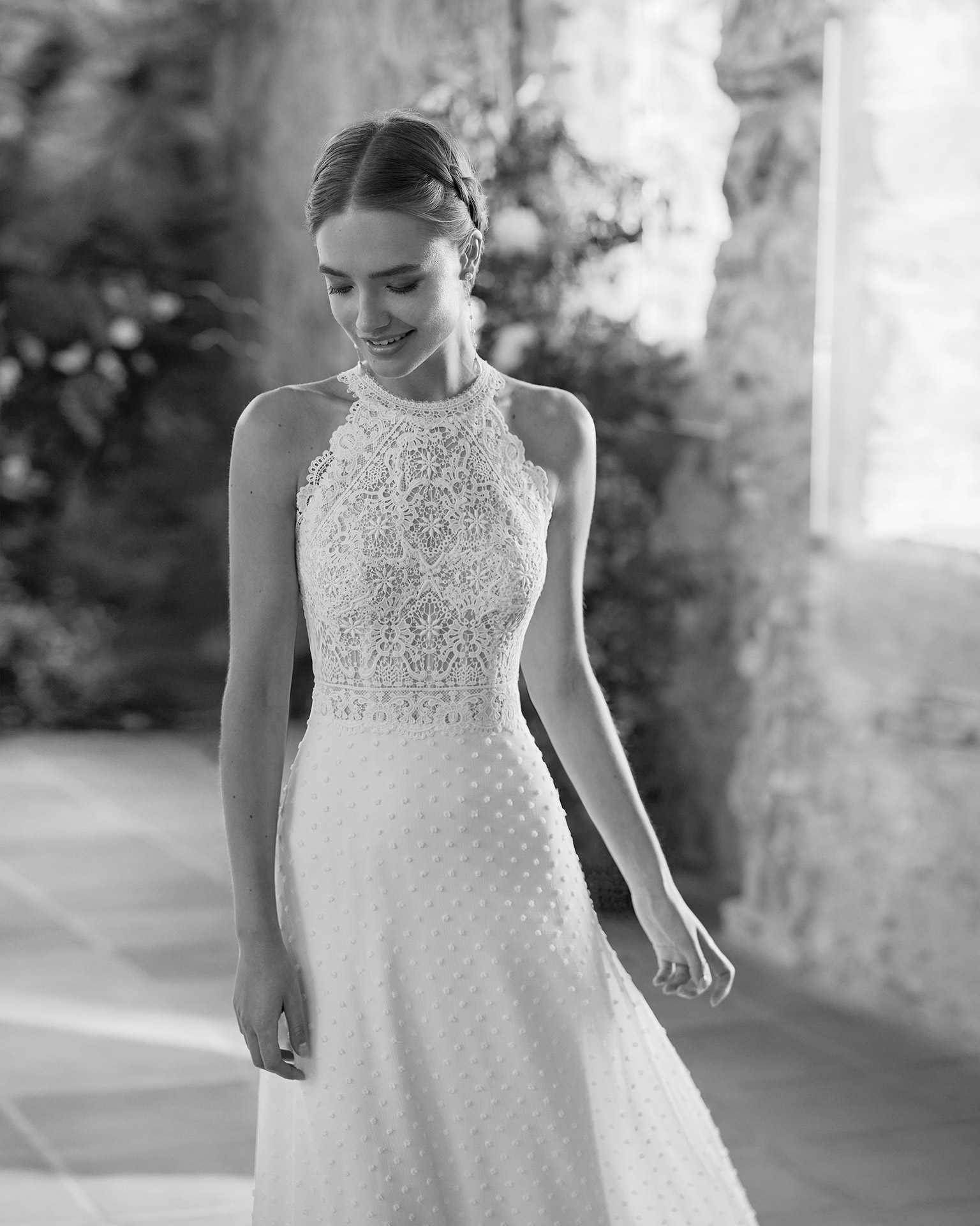 Vestido confeccionado en gasa con topos y encaje cuello halter y espalda cerrada con botones de perlas de la colección ALMA NOVIAS
