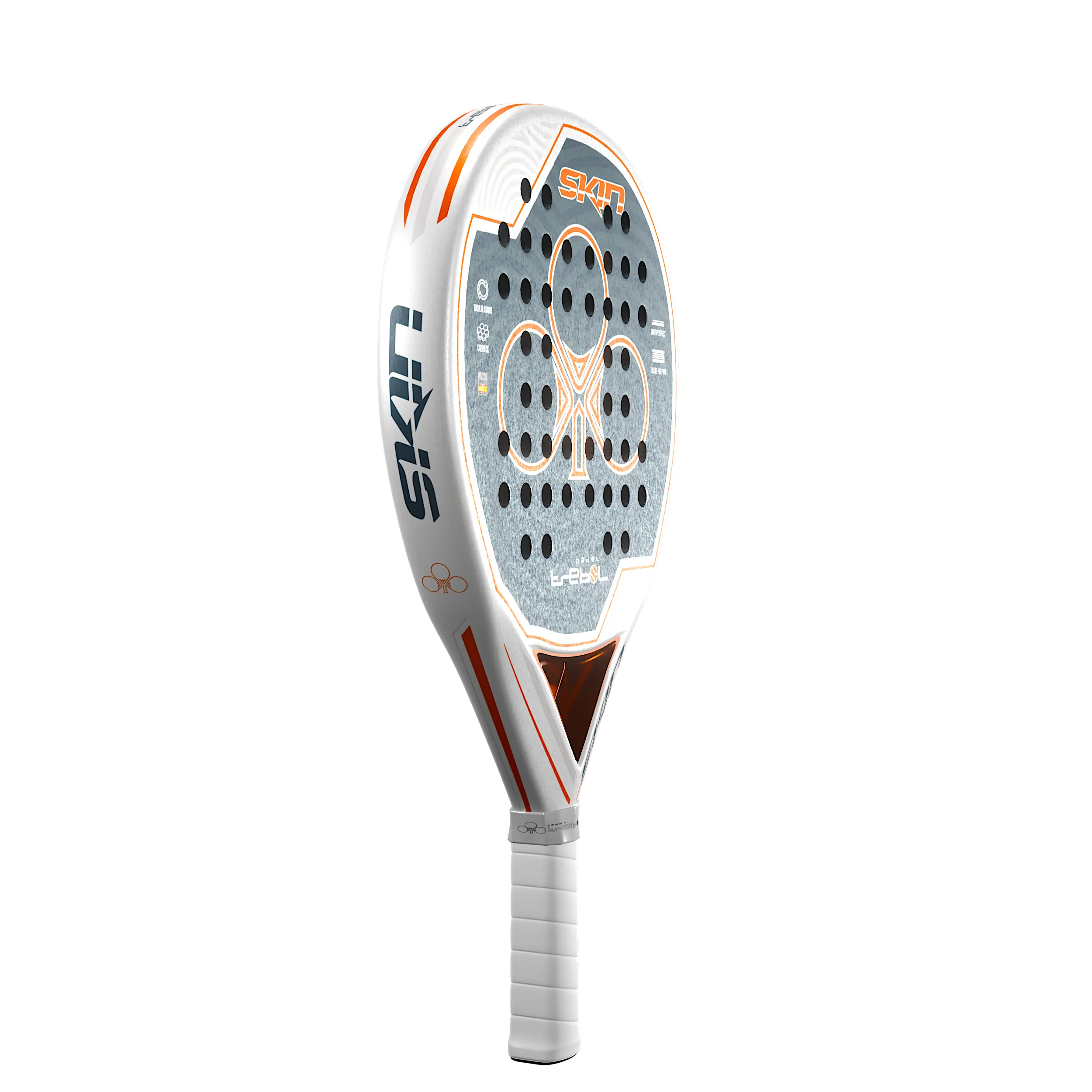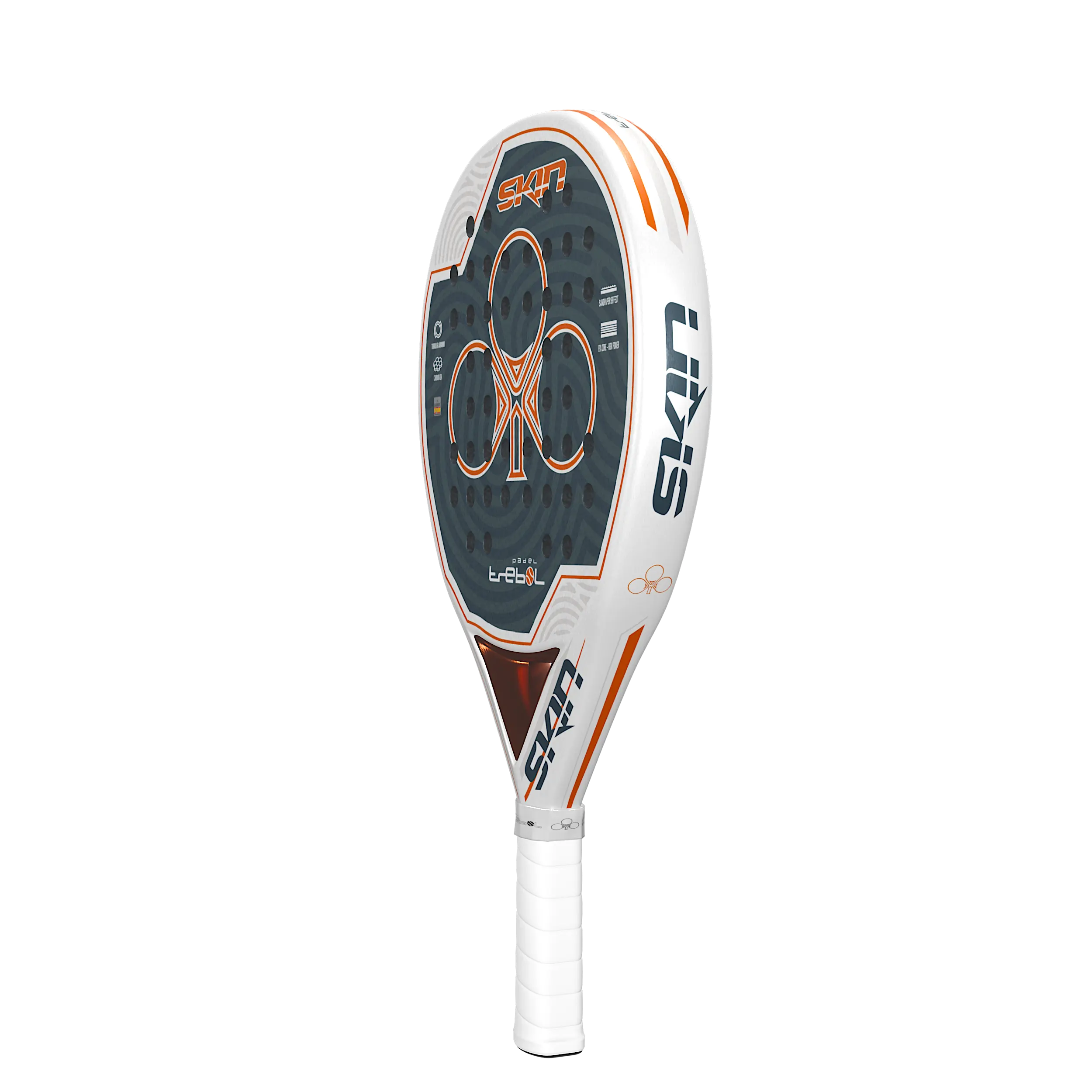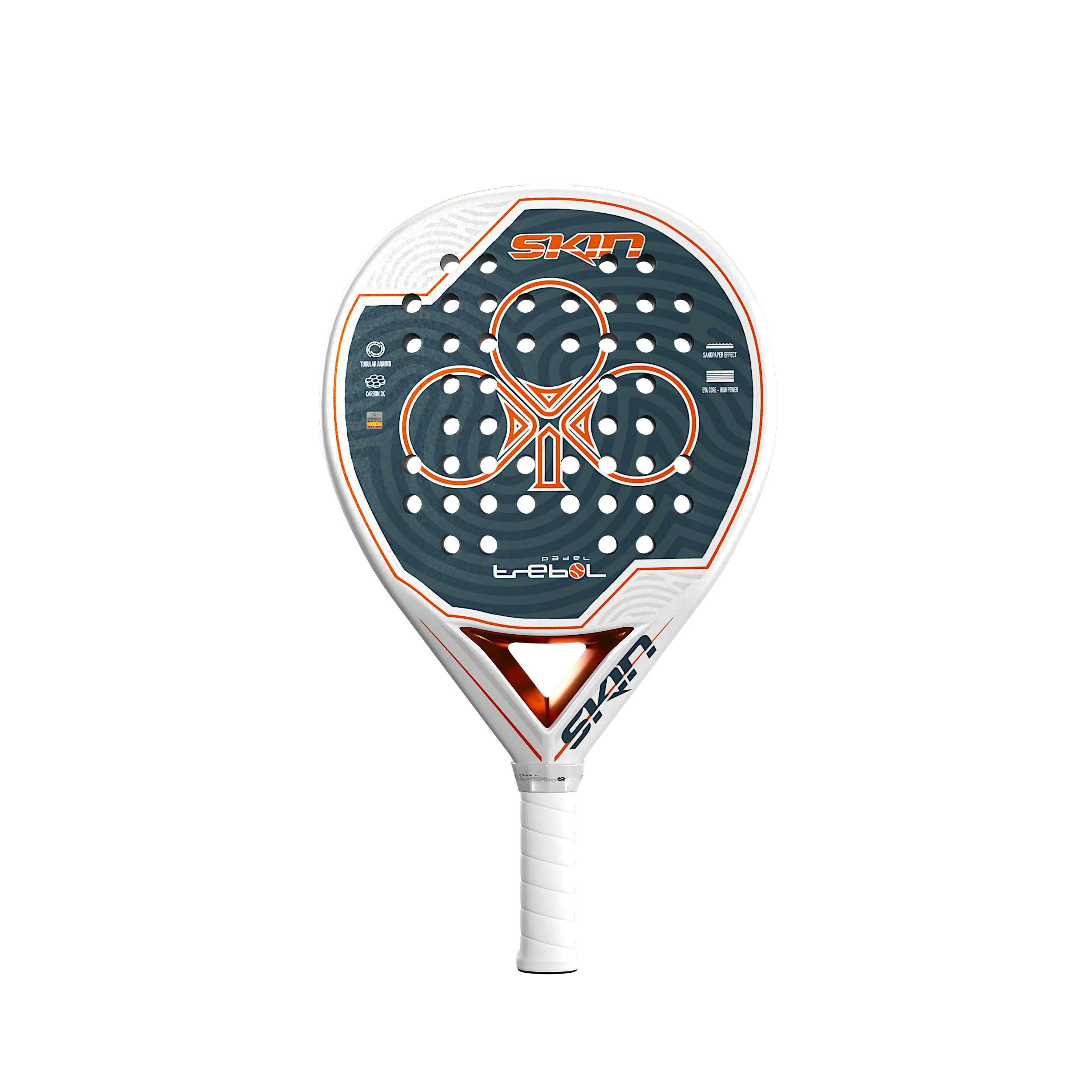 La nueva pala Trébol Skin BL , gracias a sus caras de carbono 3k en su plano , tubular de Armida/Carbono en el marco hacen una pala muy equilibrada respecto a control /potencia , es una pala muy agradable , de tacto medio y muy resistente. Esta nueva pala tiene incorporado un difusor central en cobre metálico que nos hace un balance medio/bajo y una decoración espectacular en diseño. Mantenemos el acabado rugoso mate efecto lija para toda la pala y una base en blanco con decoraciones en cobre y grises. ¡Una pala que sabemos será una de nuestro top ventas!