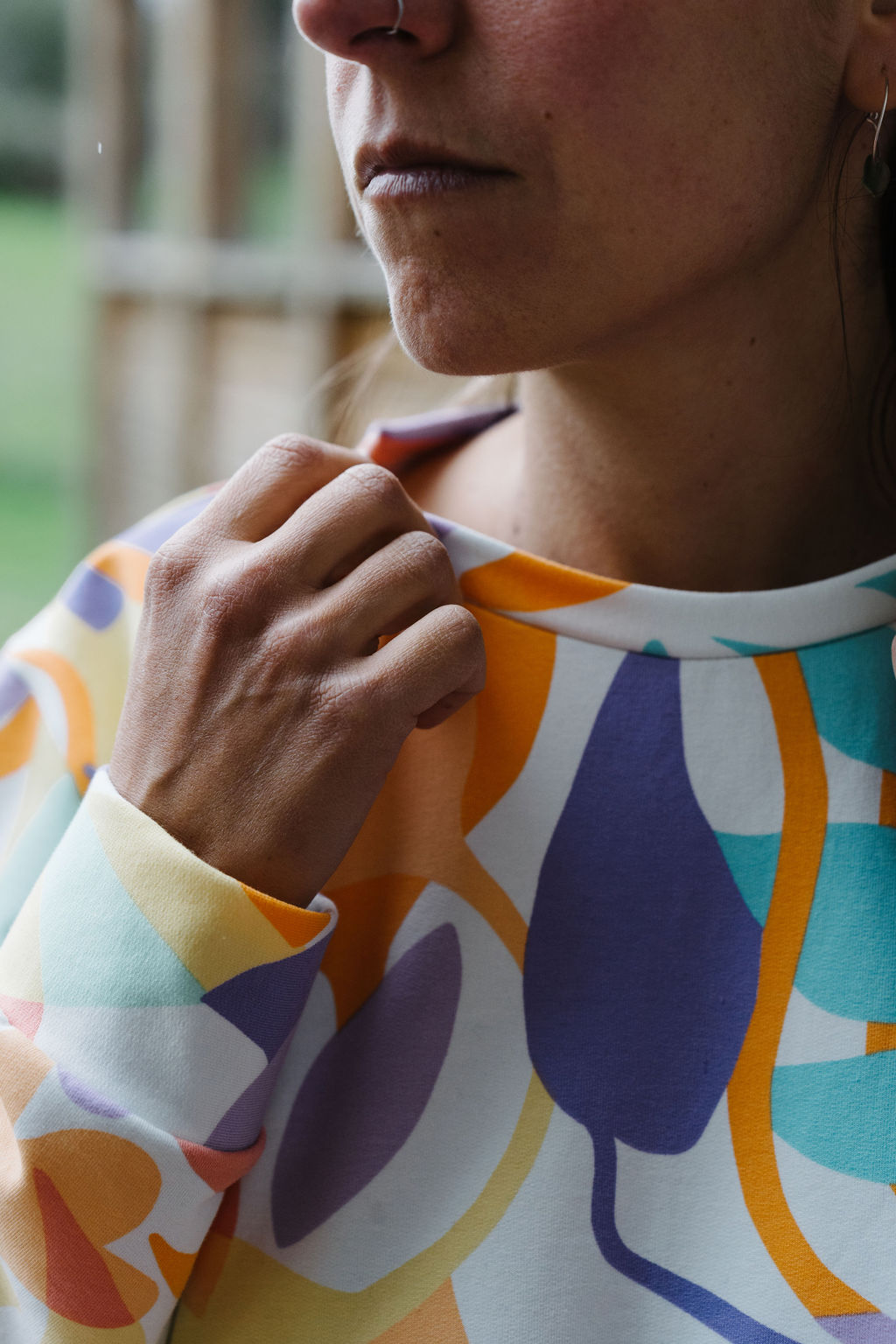 Corte ovesize un poco en evase, cuello redondo y puños en las mangas.
